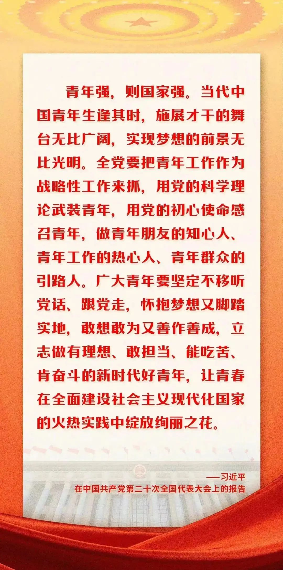 总书记在报告中对广大青年的寄语和期待,让我们充满了奋进的力量。未来的发展前景是光明的,虽然我们面临的挑战十分严峻,但生逢其时的中国青年,施展才干的舞台无比广阔,实现梦想的前景无比光明,我们要坚定理想信念,志存高远、脚踏实地、锤炼本领,不负党和人民的殷切期望,勇做新时代的弄潮儿。