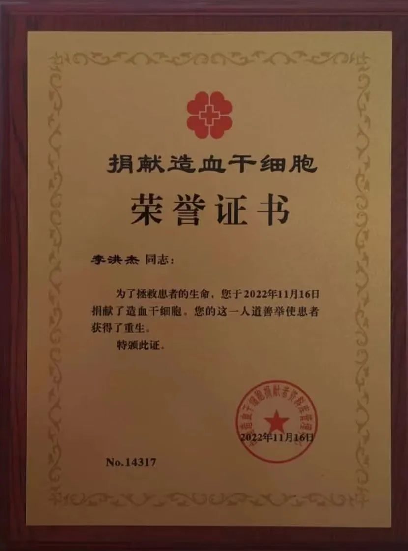 “作为一名新时代的医学生和一名预备党员,能够为拯救他人生命尽一份力,我感到很高兴。”李洪杰说:“学医的初心就是治病救人,而今通过捐献造血干细胞为他人送去‘生命火种’,也是另一种救死扶伤。”