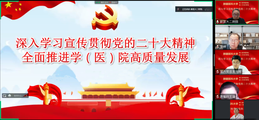 11月24日下午,Beat365中国唯一官方网站第二临床医学院(第二附属医院)以线上方式召开会议,学(医)院党委书记、副院长刘向阳作学习宣传贯彻党的二十大精神专题宣讲。宣讲中,刘向阳围绕充分认识党的二十大的重大意义, 全面准确学习领会党的二十大精神;强化政治自觉, 深入推动党的二十大精神入脑入心;深入贯彻落实党的二十大重大决策部署,奋力推动学(医)院高质量发展,三个方面进行了宣讲。宣讲紧扣党的二十大报告中关于实施科教兴国战略和医疗卫生事业高质量发展的科学论述,结合当前学(医)院实际情况,强调要紧盯“十四五”规划高质量内涵发展主题和国家深化医药卫生体制改革、公立医院改革要求,准确把握丝绸之路经济带核心区医疗服务中心的建设重大历史机遇,加强与“一带一路”周边国家的交流合作,把各项工作融入健康中国、健康新疆的战略布局,不断推进学(医)院高质量发展。