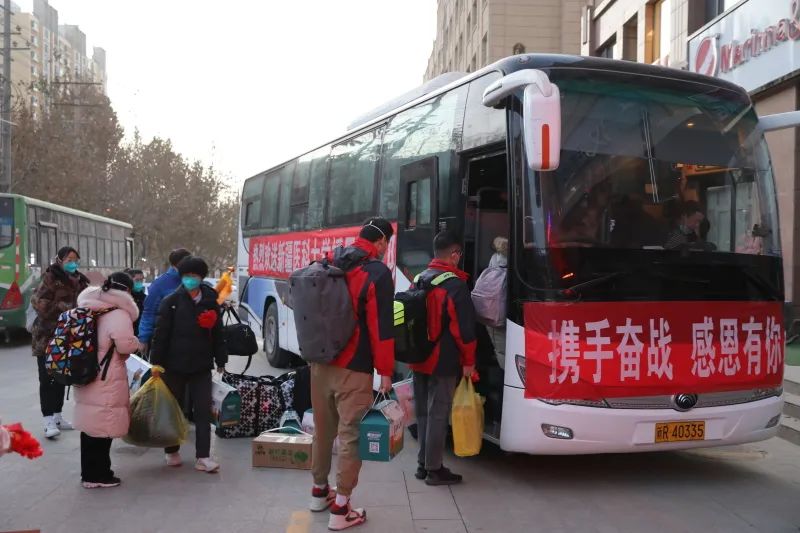 本轮疫情发生以来,援策医疗队队员义无反顾、慷慨出征。在策期间奋勇冲锋、无私付出,圆满完成了核酸检测等工作任务。当天伴随他们归程的是鲜花,是掌声……这些逆行的勇士们,乘坐着悬挂“感恩逆行、致敬英雄”等标语的大巴车赶往和田机场。和田地区有关领导也到机场欢送,向医疗队代表颁发荣誉证书,赠送锦旗以及感谢信。