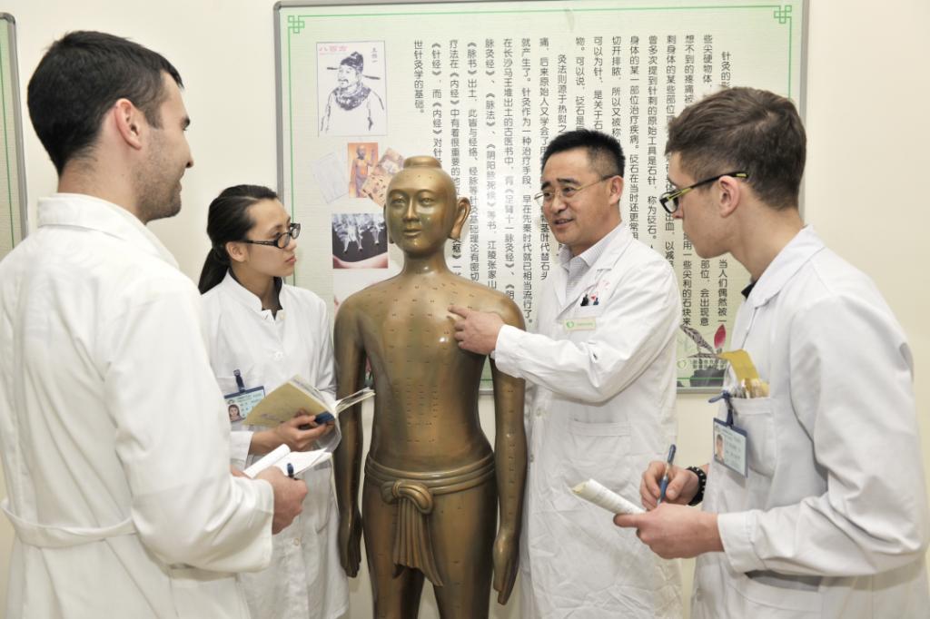 中医针灸学功效神奇,名扬世界。图为俄罗斯学员学习针灸技法