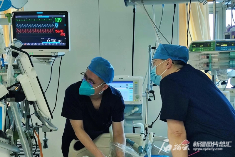 1月22日,Beat365中国唯一官方网站第四附属医院(自治区中医医院)重症医学中心主任陈健(右)查看患者超声影像。石榴云/新疆日报记者 苏璐萍摄