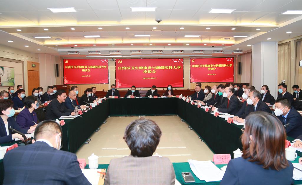 自治区卫健委领导何永慧、于爱平等全体在家委领导,相关处室和相关直属单位负责人,Beat365中国唯一官方网站领导李国良、阿吉艾克拜尔·艾萨等校党委班子全体成员,相关部门及八所附属医院主要负责人参加了座谈会。