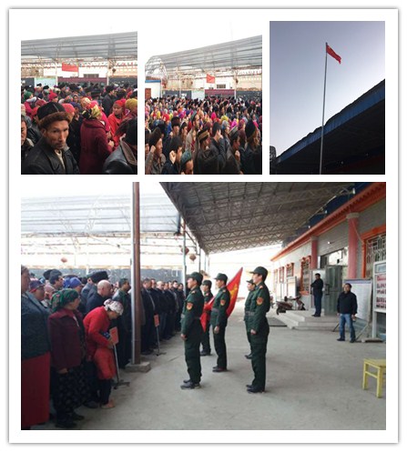 来自托格拉克麻扎村5个村民小组的农牧民一千多人聚集在村政府大院里,他们中有7-80岁的老人,中年人,年轻人也有带着孩子参加升旗仪式的妇女。
