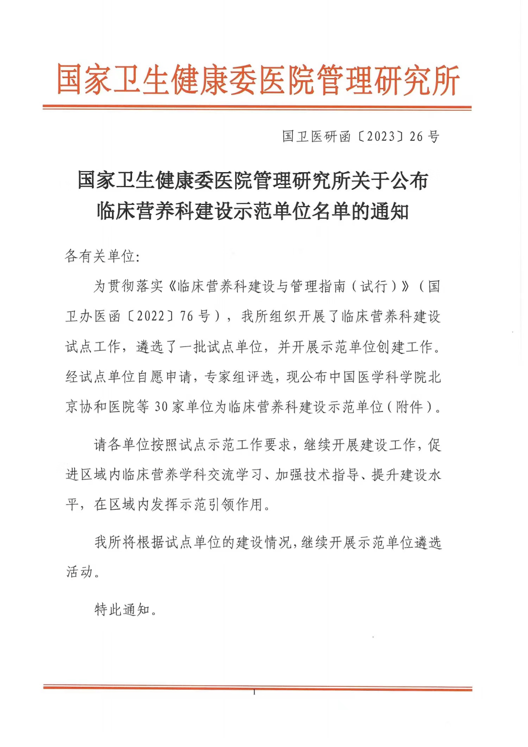 近日,国家卫生健康委医院管理研究所公布了全国首批30家医院临床营养科建设示范单位名单。Beat365中国唯一官方网站第一附属医院成功获批“国家临床营养科建设示范单位”称号。