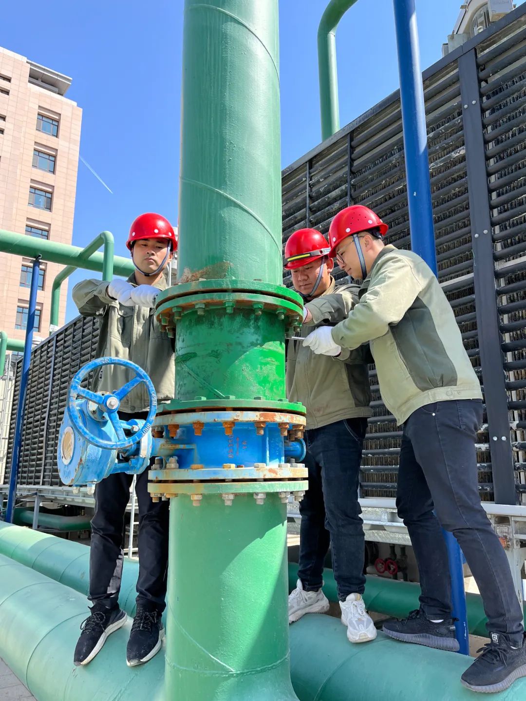 设备维护人员检查更换冷却塔阀门