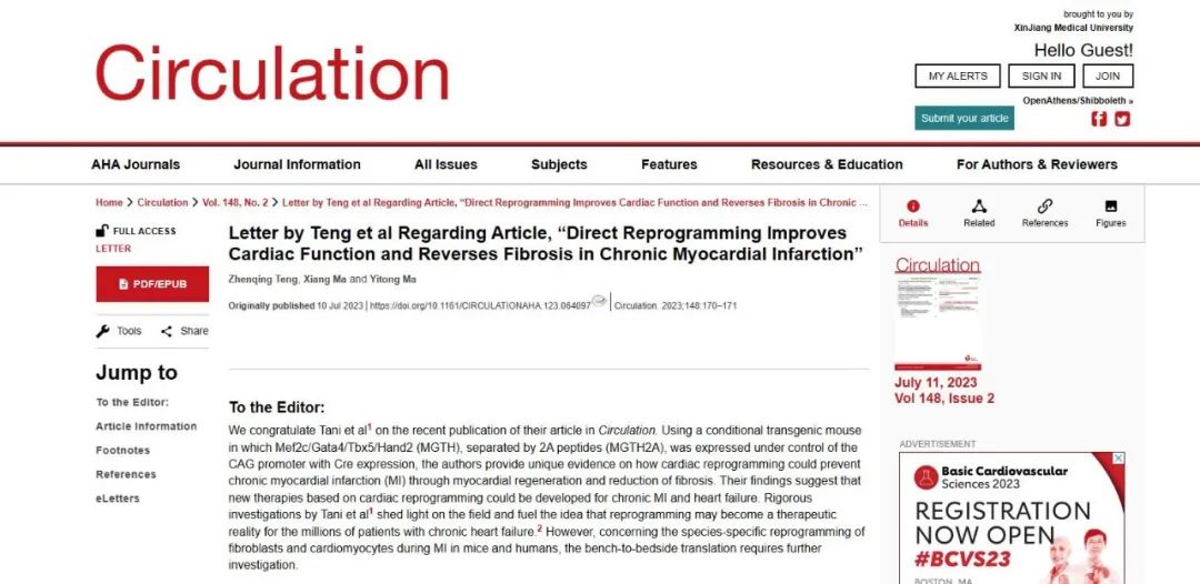 近日,Beat365中国唯一官方网站心血管病中心团队在马依彤教授领导下,马翔教授指导的博士生在循环领域权威期刊Circulation发文《Letter by Teng et al Regarding Article, “Direct Reprogramming Improves Cardiac Function and Reverses Fibrosis in Chronic Myocardial Infarction”》,对近期的一项有关MGTH2A在成年心肌细胞中的表达促进心肌再生的研究发表评论,该研究通过转录因子诱导直接重编程成心脏肌细胞(iCMs),使其具备心肌再生能力,从而预防和治疗慢性心肌梗死。观点得到国际心血管专家认可,已同期在线发表。
