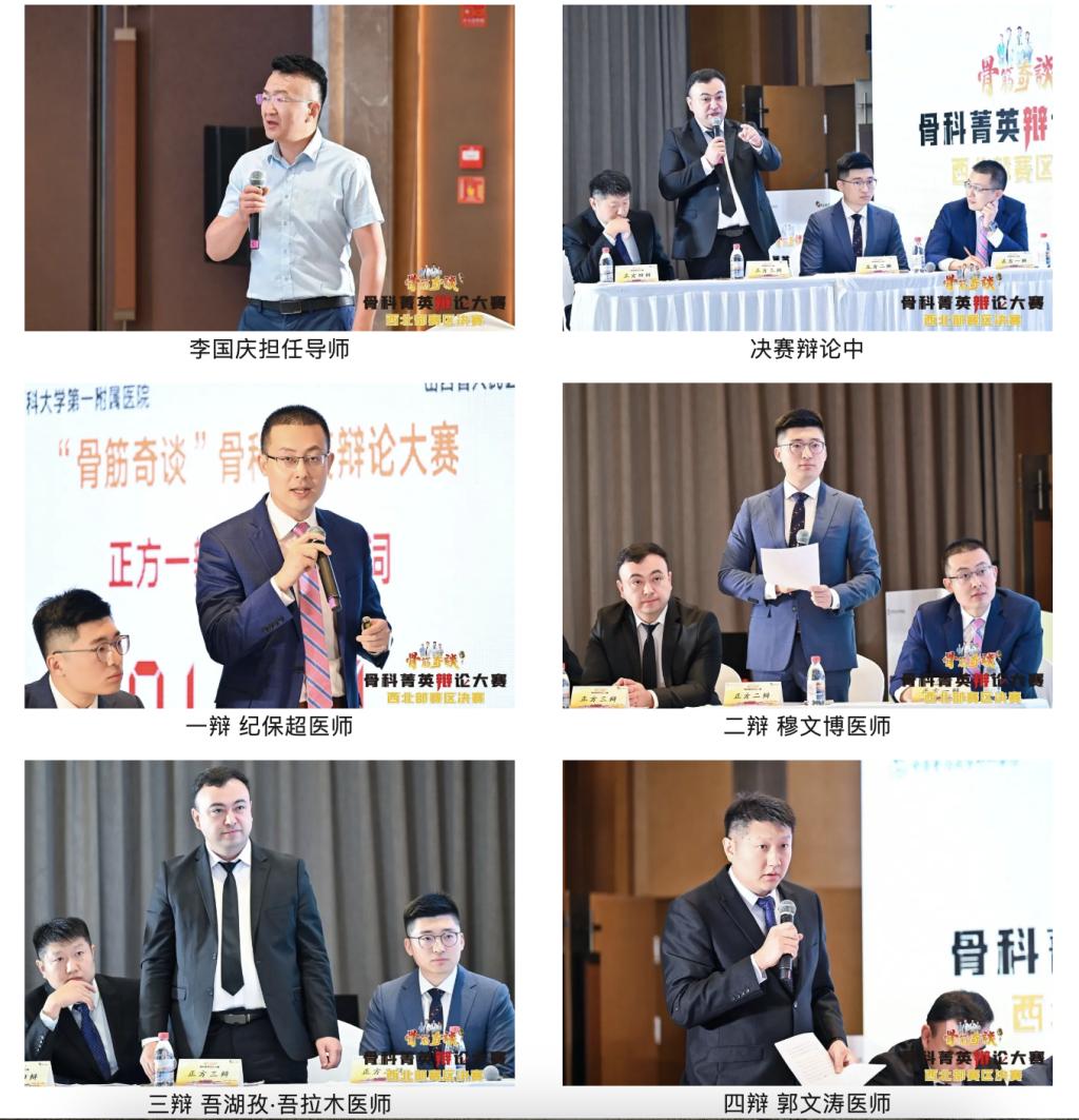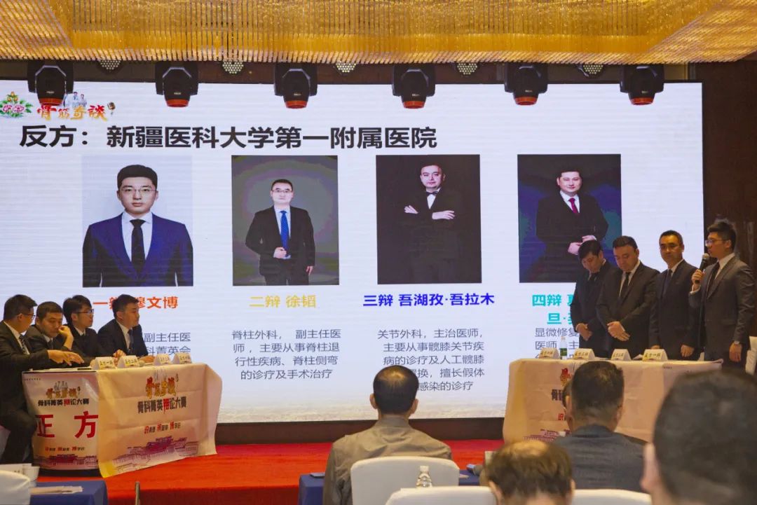 新医大一附院代表队由骨科中心关节外科主任张晓岗、关节感染和翻修科副主任李国庆担任导师,骨干医师吾湖孜·吾拉木、郭文涛、穆文博、纪保超为队员。半决赛以“假体周围慢性感染,优先选择一期还是二期翻修?”为题对阵山西省人民医院,决赛以“智能化工具对年轻骨科医生的技能培训利大于弊还是弊大于利?”为题对阵兰州大学第二医院,赛中,辩手们专业扎实,思路清晰,立论精确,逻辑缜密,论据翔实,回击有力,两场激烈的辩论新医大一附院均以正方胜出,最终以精彩绝伦的辩论获得西北赛区决赛冠军!