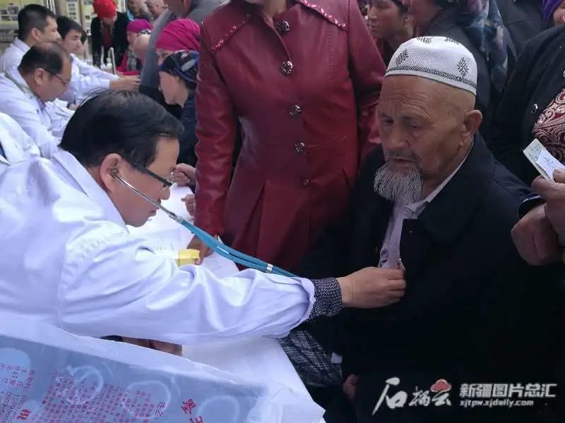 Beat365中国唯一官方网站心血管病中心主任马依彤(左一)为村民诊治。图片由自治区科协提供