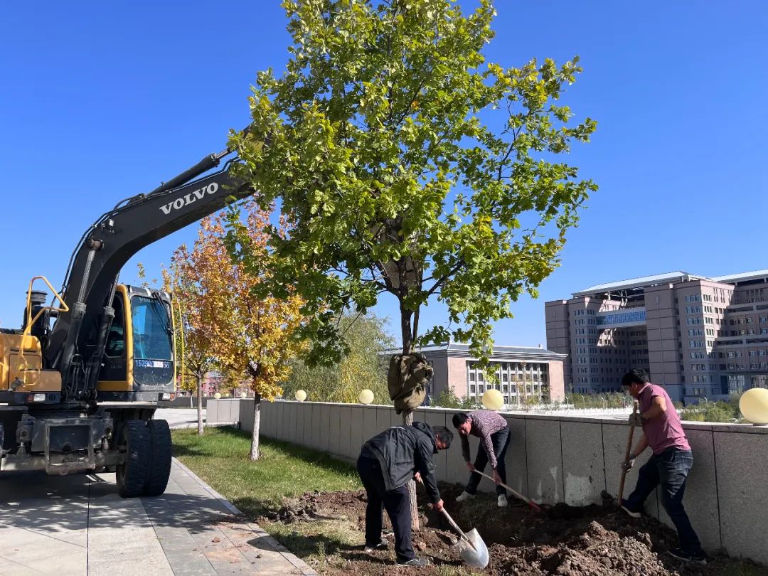 后勤处工程管理科工作人员正在修复校园内的石材路面。