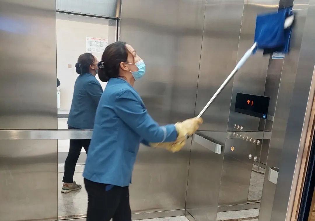 后勤处物业中心的保洁员擦拭电梯间,为同学们提供干净整洁的学习生活环境。