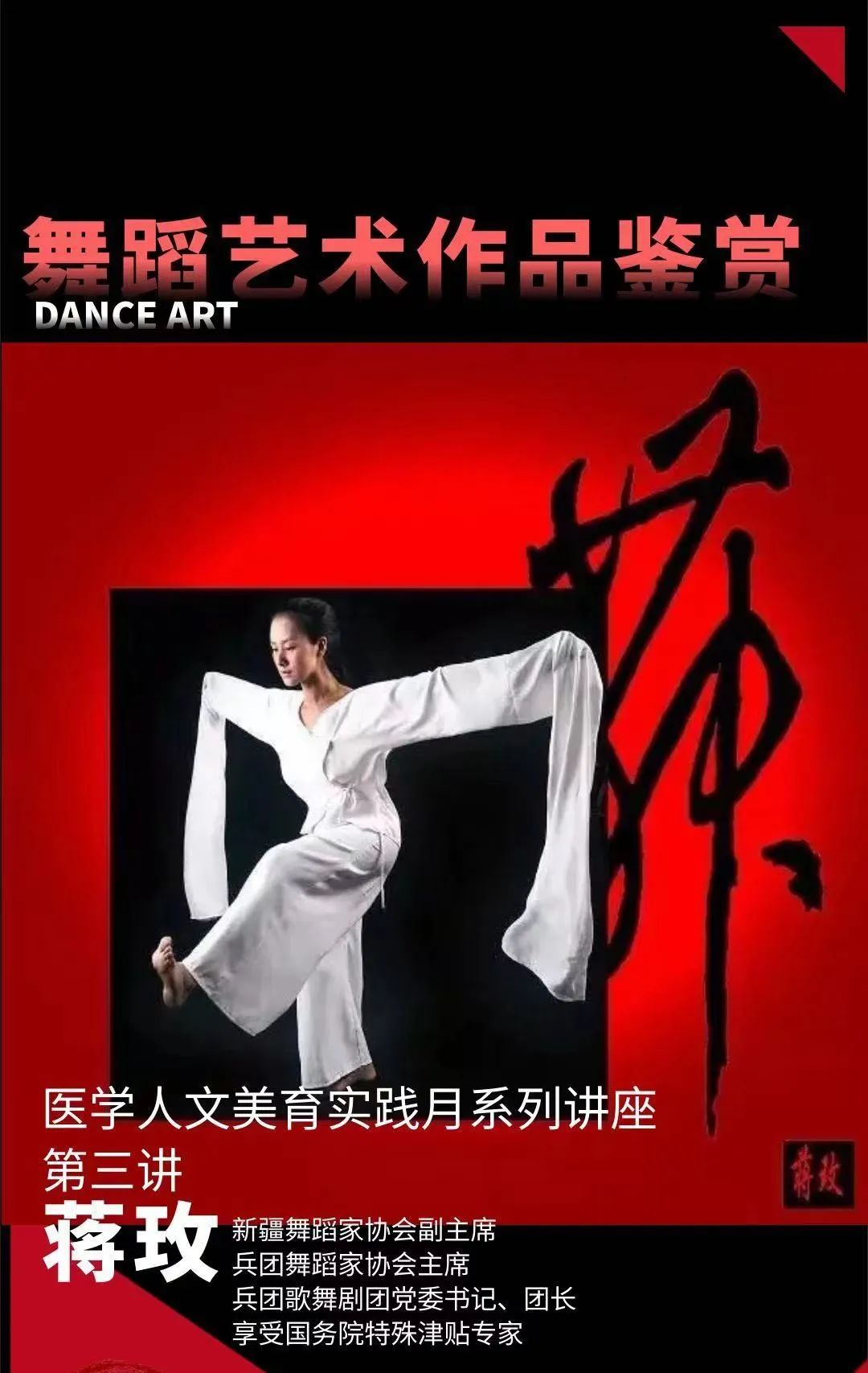 作为Beat365医学人文美育实践月系列活动之一,Beat365邀请校内外文学、艺术领域的专家学者,举办了弘扬中华优秀传统文化、文艺鉴赏、艺术实践、人文关怀等主题的系列讲座。在第三场讲座中,蒋玫老师从舞蹈鉴赏的本质、舞蹈的基本原理、舞蹈与文化三个方面,向同学们传授了舞蹈的基本原理和舞蹈创作的方法技巧,用生动形象的舞蹈作品诠释了舞蹈和文化的关系。她结合自己的成长经历,和同学们分享了自己对于舞蹈梦的追求和对新疆这片土地的热爱,并向大家展示了自己创作的舞蹈艺术作品,主题是对既是英雄又是普通人的兵团战士的讴歌和赞美。作品中蕴含的真诚情怀与价值观,让同学们感受到了艺术的魅力与力量。