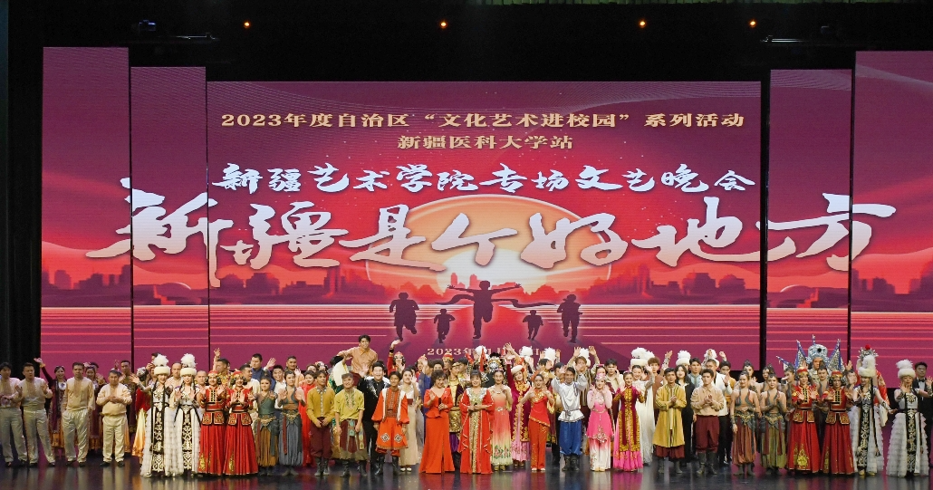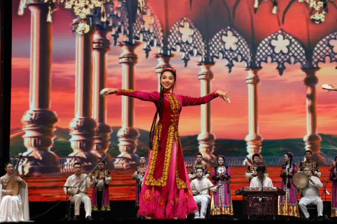木卡姆表演《且比亚特木木卡姆片段》分外抢眼,演员们用特有的曲调、高亢粗犷的唱腔和刚劲有力的舞姿,让全场和着音乐击节鼓掌。