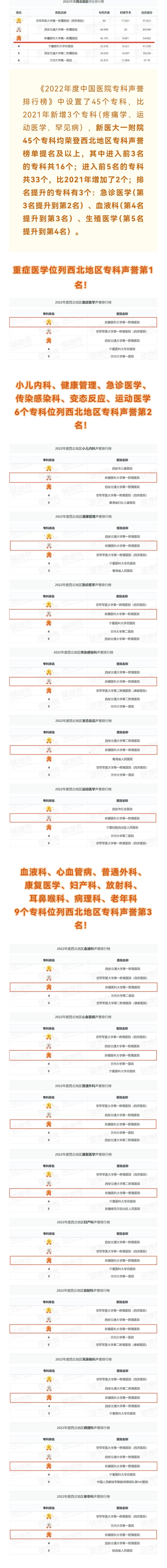 整形外科、胸外科、生殖医学、肾脏病、麻醉科、临床药学、口腔科、骨科、超声医学9个专科位列西北地区专科声誉第4名!