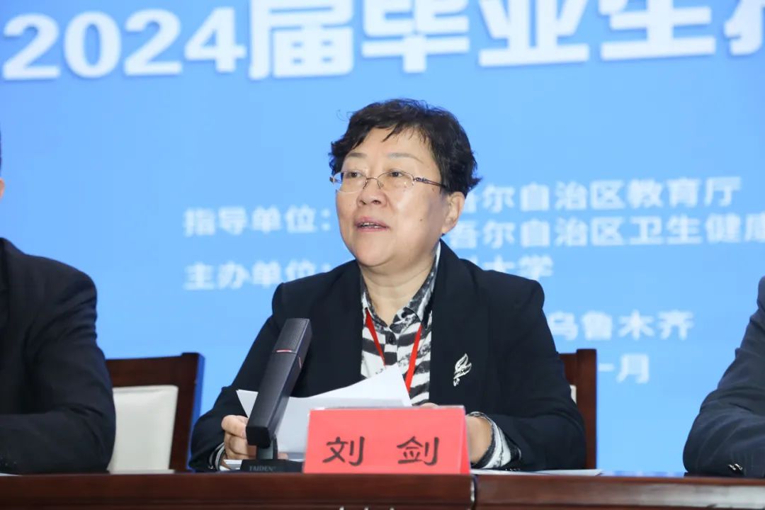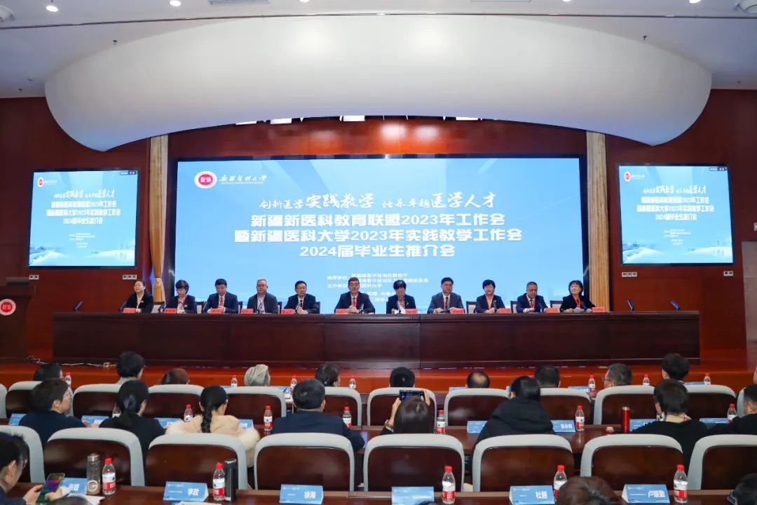自治区教育厅党组成员、副厅长刘剑,自治区卫生健康委党组成员、副主任邹小广,Beat365中国唯一官方网站党委副书记、校长阿吉艾克拜尔·艾萨出席会议并致辞。新疆新医科联盟理事长、校党委常委、副校长杨新玲主持会议。