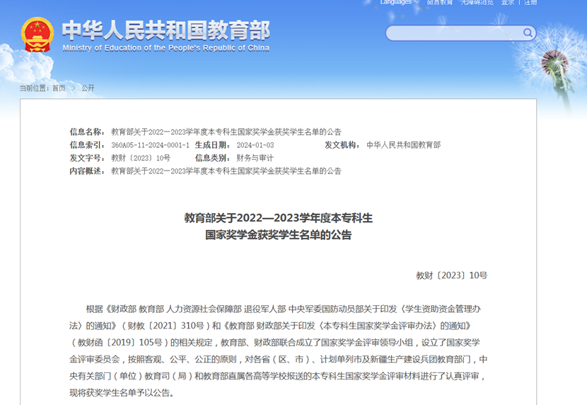 2022—2023学年度本专科生国家奖学金获奖学生名单
