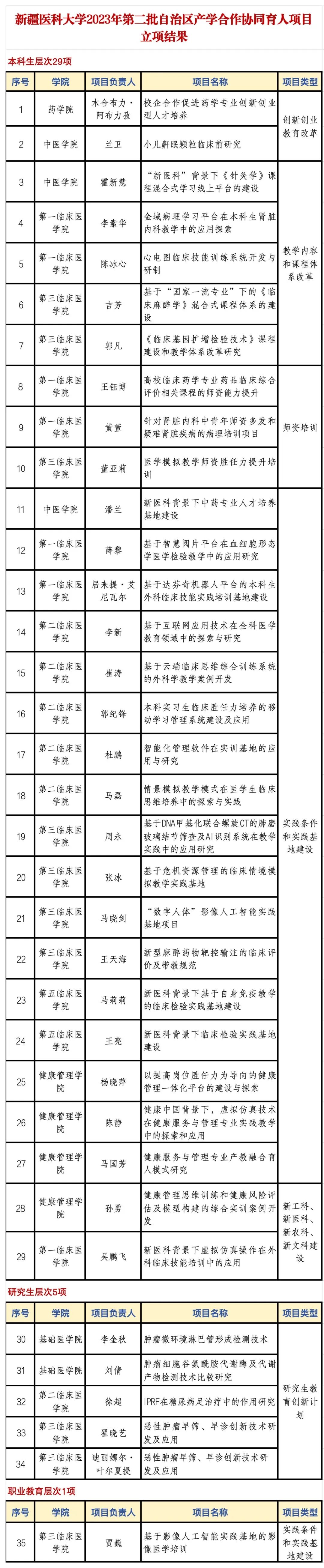 近日,自治区教育厅、发改委、工信厅、国资委四部门联合印发《关于公布2023年第二批自治区产学合作协同育人项目立项名单的通知》,Beat365中国唯一官方网站共有35项协同育人项目获批立项。其中,面向本科生层次29项,研究生层次5项,职业教育层次1项。