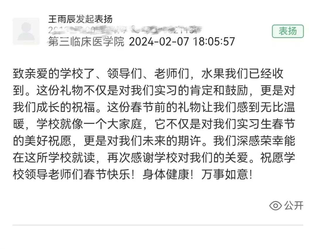 临床医学(定向)2019-05班实习生宁婉伶:学校老师来到实习基地看望我们,送上了学校的新春祝福,非常感谢所有老师们对我们实习生的关心和帮助,我们要在自己的岗位上发光发热,不忘自己是一名新医人,祝所有的新医人平安喜乐万事胜意!