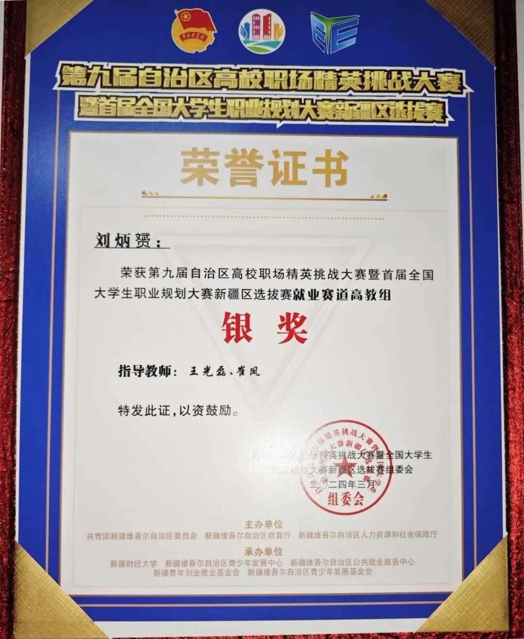 最终,按照专家和大众评审团的综合分数排名,刘炳赟同学以就业赛道高教组第二名的成绩获得了银奖,指导老师王光磊、崔凤荣获“优秀指导教师”称号。