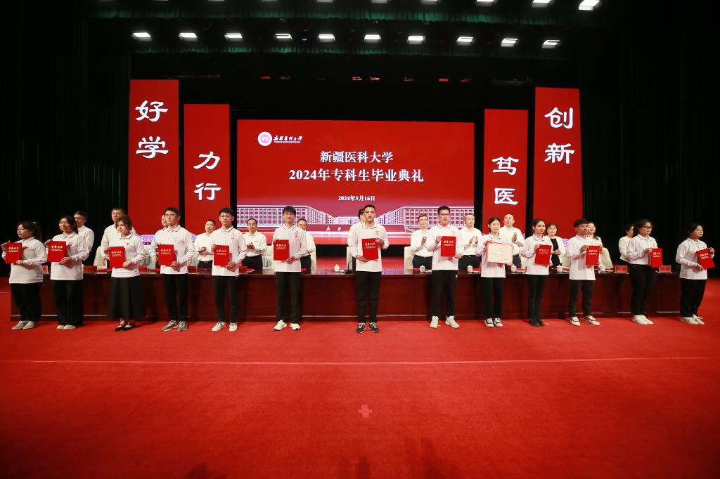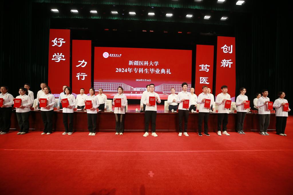 赵天杰在讲话中代表学校,向顺利完成学业的同学们表示热烈祝贺!他说,三年里,你们在新医学习知识、精进蜕变、收获友谊,谱写了属于你们大学时代的青春之歌。三年里,你们与老师在教学相长中温暖彼此、互相成就,共同提笔书写了学校高质量发展的新篇章。希望同学们不论身处何方都坚持“立德、向善、求真、务实、尚美”。希望你们像一粒种子,带着新医的红色基因和校训精神,播撒到祖国和人民需要的地方,向下扎根、向上生长,用满腔热血、青春年华去践行习近平总书记提出的殷殷嘱托,立志做有理想、敢担当、能吃苦、肯奋斗的新时代好青年!赵天杰对毕业生们提出了殷切期望:一是心怀家国,做有理想的青年。大学的根本任务是立德树人,就是要教会同学们如何做人。孙中山先生讲,“做人最重要的事情,就是要知道怎样爱国。”爱国是一个人的立德之源、立功之本、成才之基。对于中国人而言,家是最小国,国是千万家,家国一体、家国同心是根植于中华民族灵魂和血液深处,激发我们风雨无阻向前进的力量源泉。翻开新医的校史,历代新医人力学笃行,将家国情怀融进了薪火相传的血脉基因。70年前,一大批来自北京、上海、山东、辽宁等地的优秀教师、医务工作者,满怀报效祖国、奉献人民的热情,放弃了优渥的生活条件,不远万里从繁华都市汇聚到老校区的鲤鱼山下,投身新疆医学事业。正是一代代新医人在家国情怀的感召下、在报效祖国的热忱中,拼搏奋斗、勠力同心,将个人命运与时代紧密相连,为边疆医学事业奉献无悔青春,才构筑起今日新医高质量发展的坚实根基。希望同学们把报效祖国、服务人民作为最高理想和价值追求,传承红色基因、厚植家国情怀,把个人成长融入国家和民族发展,把“小我”融入“大我”,以己所学、尽己所能,到基层去、到一线去、到祖国需要的地方去、到人民群众欢迎你们的地方去,在广阔天地中施展才干,在推进强国建设、复兴伟业中展现青春作为、贡献青春力量!