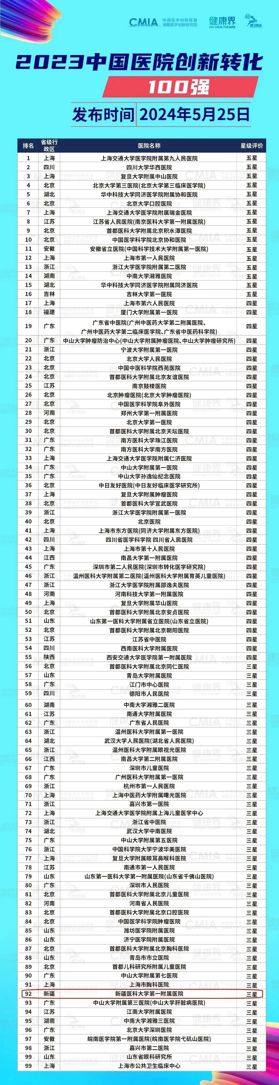 《2023中国医院创新转化100强》榜单评选出五星医院16家、四星医院39家、三星医院45家。新医大一附院被评为三星医院,是新疆唯一一家连续三年登榜的医院。