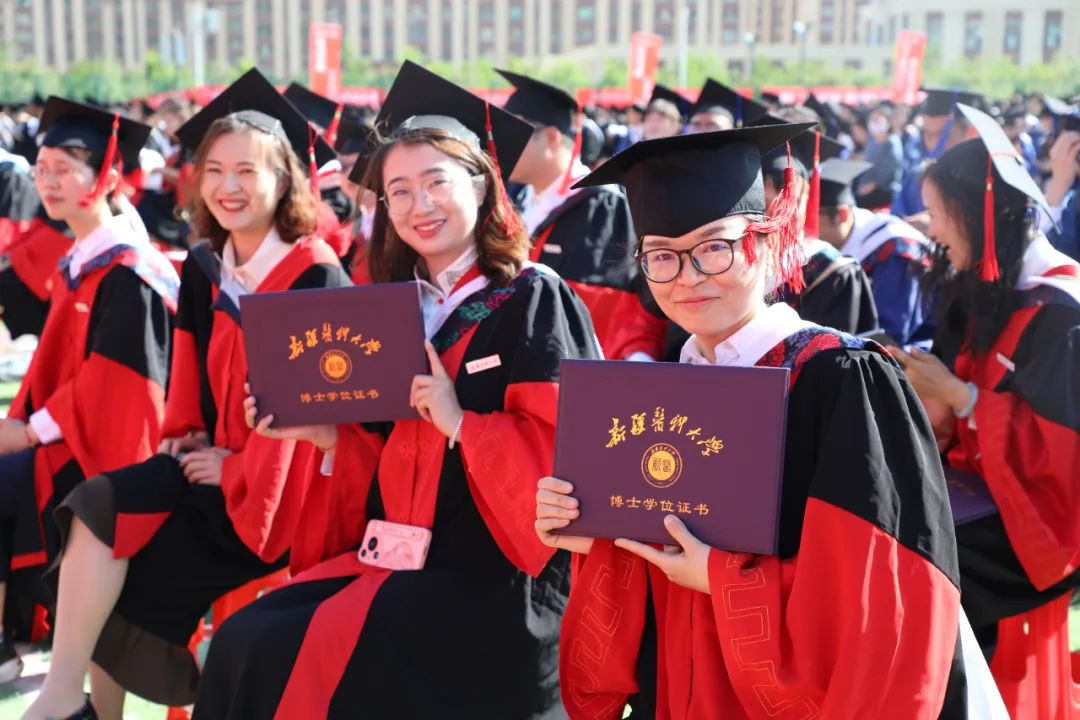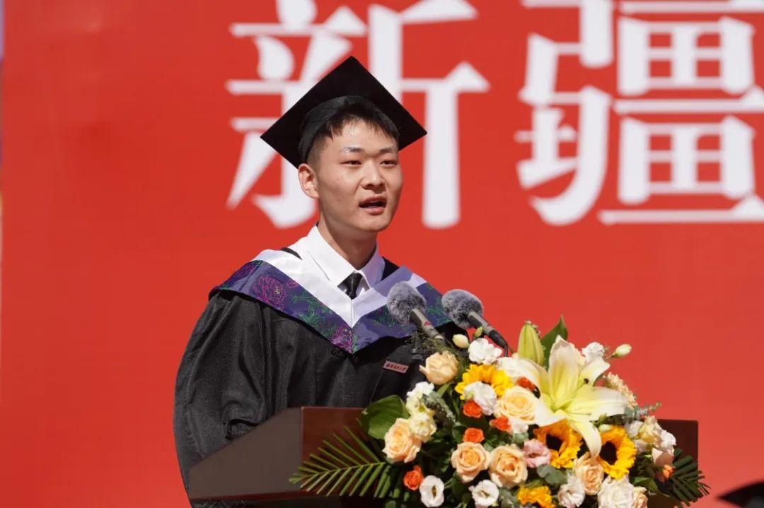 本科毕业生代表、第二临床医学院杨健辉同学,硕士毕业生代表、公共卫生学院的吐尔逊阿依•达吾提同学,博士毕业生代表、第一临床医学院的张小雪同学和留学生代表、国际教育学院的阿沙德·阿斯兰同学上台发言,深情表达了对母校辛勤培育的感谢与感恩,回顾了在校期间求知若渴、好学不倦的奋斗足迹,展现了勤于实践、锐意进取的坚强品质,和师生们朝夕相处、团结友爱的深厚情谊。毕业生们表示,无论身在何处,新医是我们永远的家,我们将带着所学本领扬帆启航,与母校一起并肩奋进,争做有向上理想,向善灵魂、向勤品格、向阳姿态、向美追求的新医学子,为人类健康福祉贡献力量,奋力书写为中国式现代化挺膺担当的青春篇章!