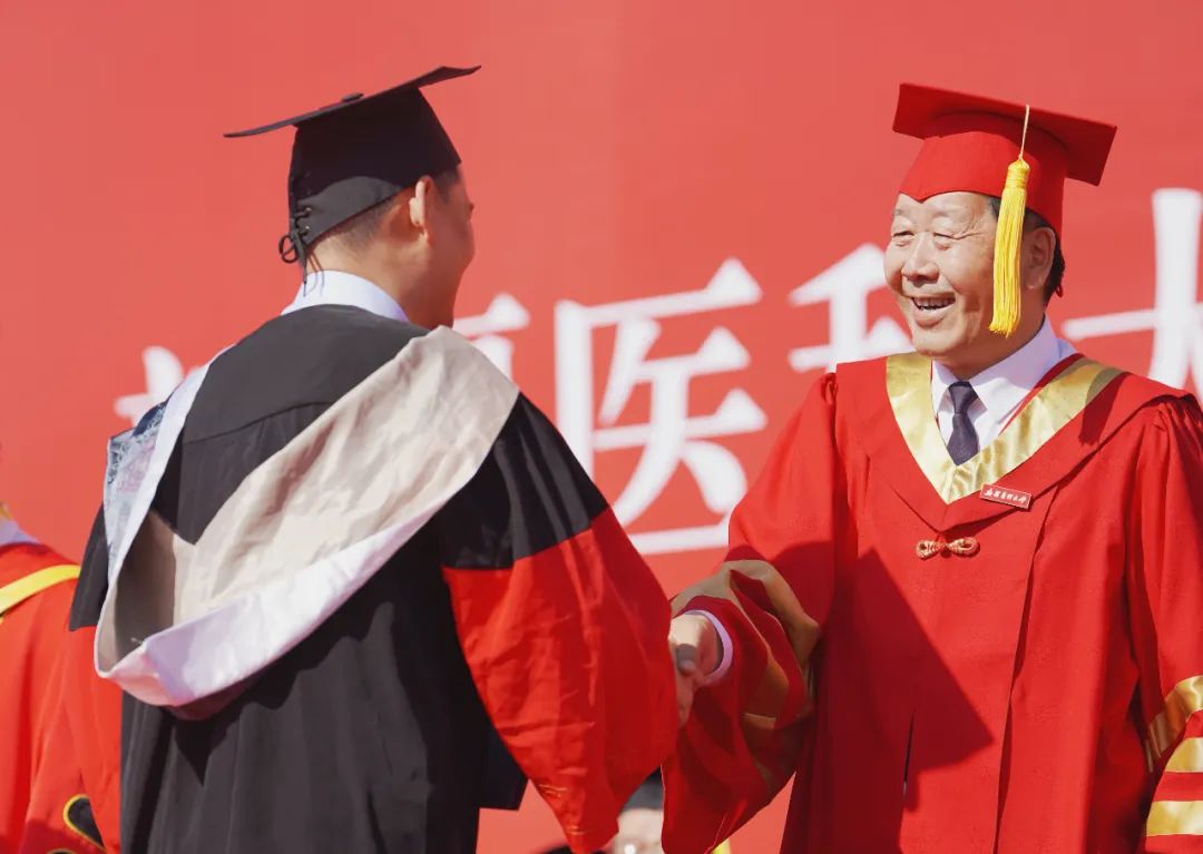 校领导为2024届毕业生代表颁发了荣誉证书、学位证书并拨穗正冠,完成青春的“加冕礼”,表达对新医学子的美好期许。