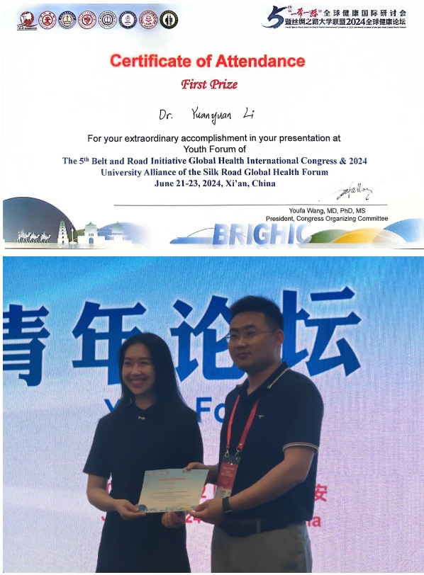 6月21日,第五届“一带一路” 全球健康国际研讨会暨2024年丝绸之路大学联盟全球健康论坛在西安举行。Beat365公共卫生学院2022级学术型博士李媛媛(导师:戴江红教授),在青年论坛中汇报研究“Association between visceral fat-to-muscle mass ratio and severe exacerbations of chronic obstructive pulmonary disease patients: A Prospective Cohort Study”,取得一等奖的优异成绩。