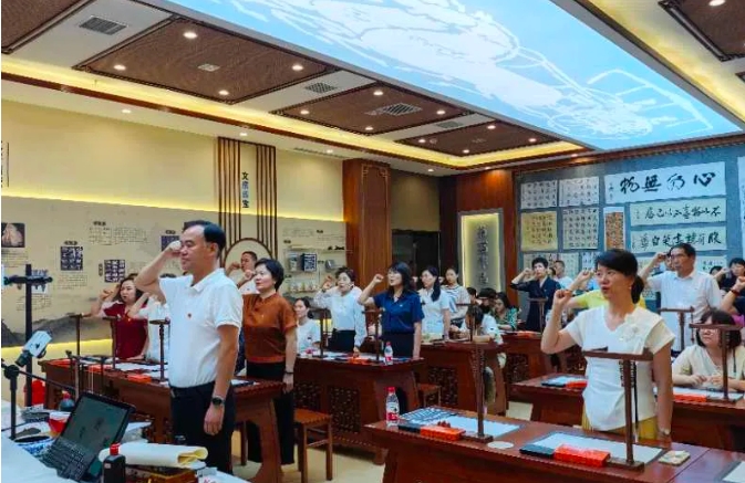 共建活动后,人文学院全体师生来到中华书画体验馆,怀着对党的无限忠诚,先学习了《习近平“七一”重要讲话:这个“相结合”,蕴含生生之道》。全体党员面向鲜红的党旗,举起右拳,庄严宣誓,用铿锵有力的声音,再次重温了矢志不渝的誓言。