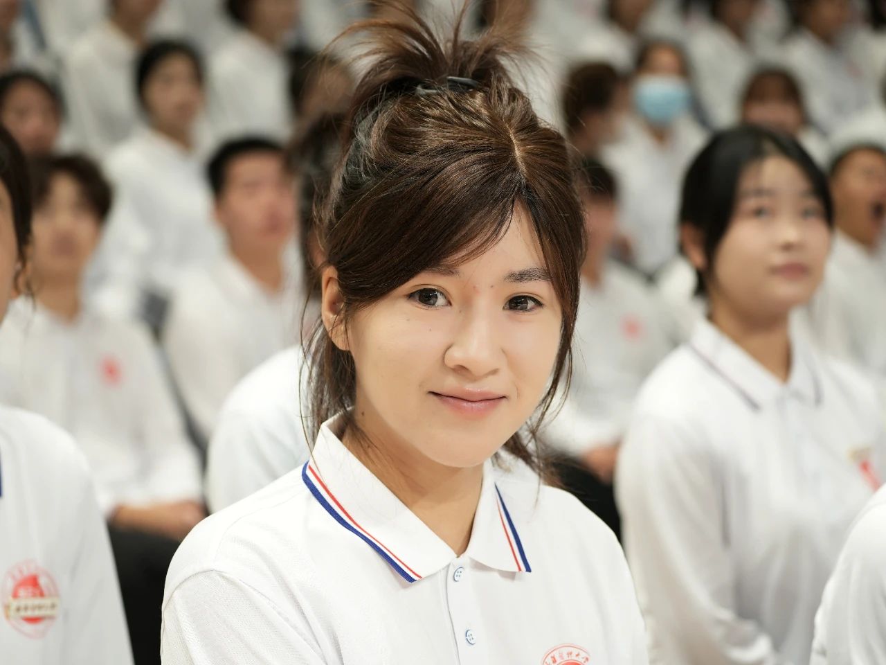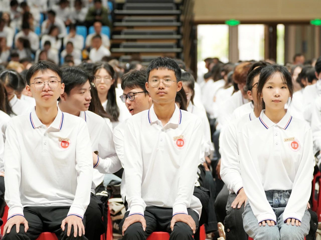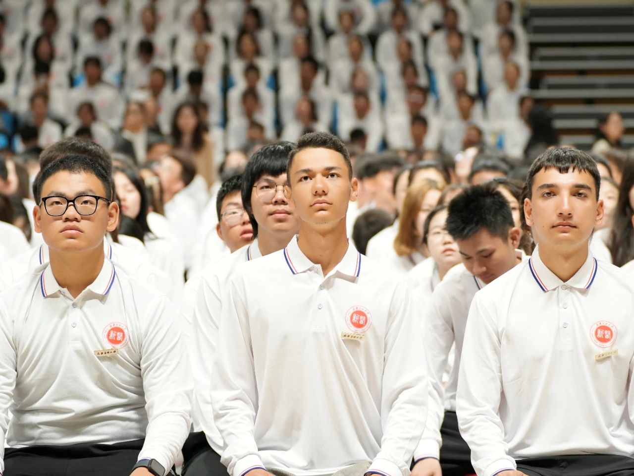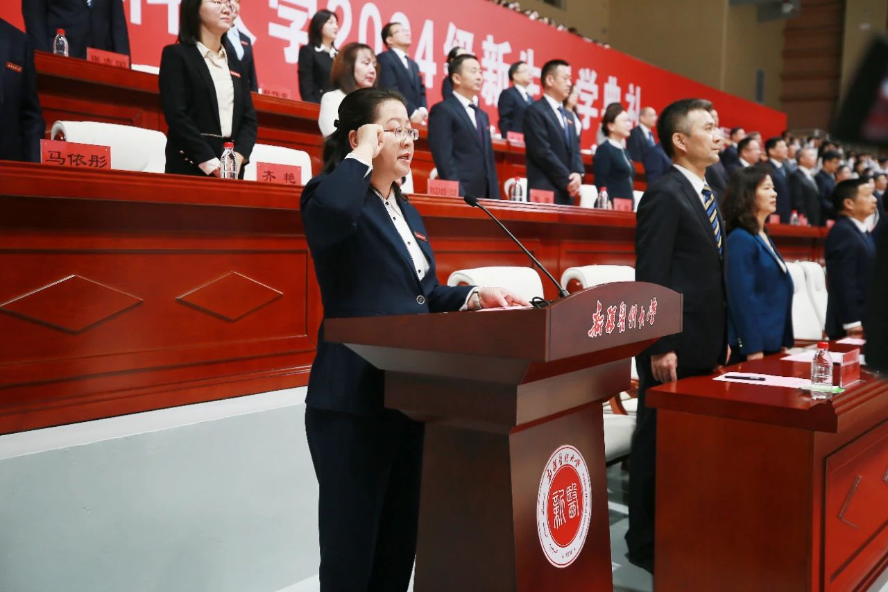 校领导为新生代表佩戴校徽。全体新生也一同起立,佩戴上了象征着光荣与自豪的“新医人”标识。2024级新同学与新医一辈子的结缘从今天正式开启,同学们将在新医开启一段逐梦的新征程。
