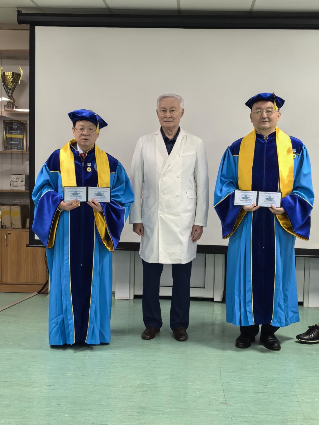 哈萨克斯坦国家医学科学中心聘请木胡牙提·乌拉斯汉和马依彤为哈萨克斯坦国家医学科学中心名誉教授,并举行了受聘仪式。专家团队一行协助哈萨克斯坦国家医学科学中心开展疑难复杂病例-冠脉支架植入术及左束支起搏器植入术4台手术示教。