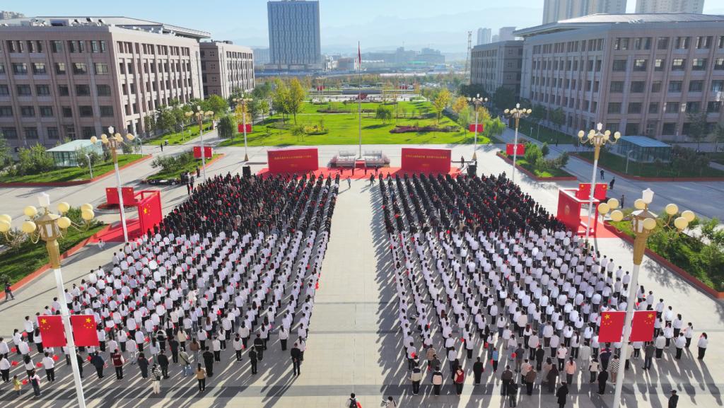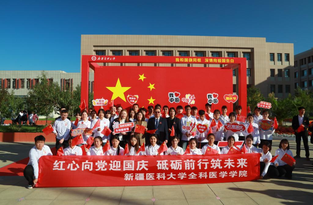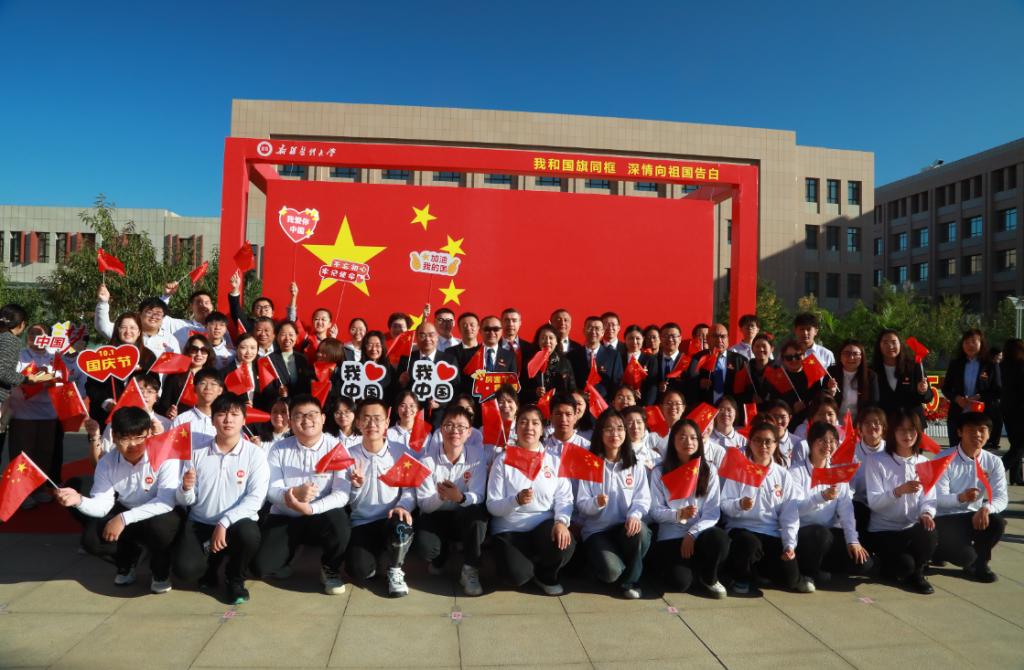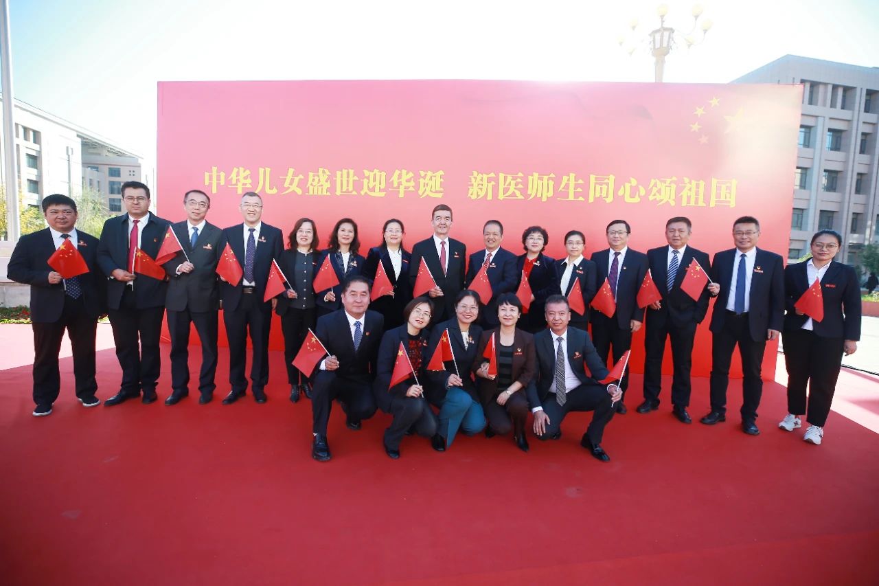 在迎风飘扬的五星红旗下,新医教师代表,药学院的李新霞教授、附属肿瘤医院的雷程副主任医师,和新医学生代表,中医学院的孙开元同学、维吾尔医学院的凯地日耶·阿不都为力同学,共同为国旗献词,表达了新疆各族儿女践行胡杨精神,扎根边疆、奉献祖国的坚定与赤诚,为实现中华民族伟大复兴的中国梦而努力奋斗的坚强决心!