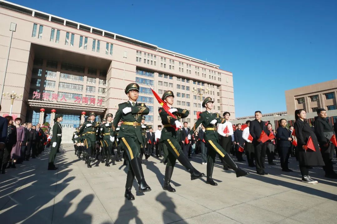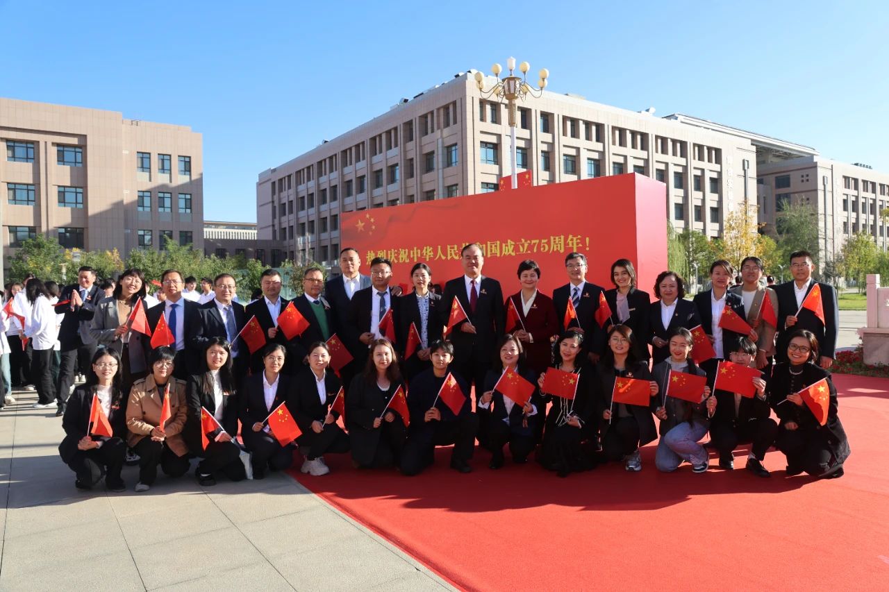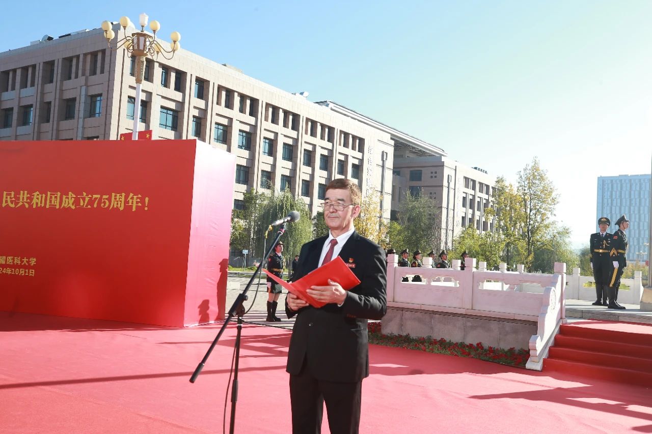 五星红旗迎着朝阳分外鲜艳,校党委副书记、校长阿吉艾克拜尔·艾萨带大家回顾了在中国共产党的坚强领导下,全国各族人民勠力同心、团结奋斗,伟大祖国发生了翻天覆地的变化,中国式现代化全面推进,中华民族正以不可阻挡的步伐迈向伟大复兴;新疆各族人民与党同心、与时俱进,天山南北发生了翻天覆地的变化,取得了空前的历史成就;学校在党和政府的关心关怀下,综合实力不断提升,迎来了发展的最好时期,正向着建设“西部一流、辐射中亚的高水平医科大学”的目标奋力前行。让我们坚定理想信念,勇于创新、敢于担当,把对党的忠诚、对祖国的热爱融入学校高质量发展的实践中。