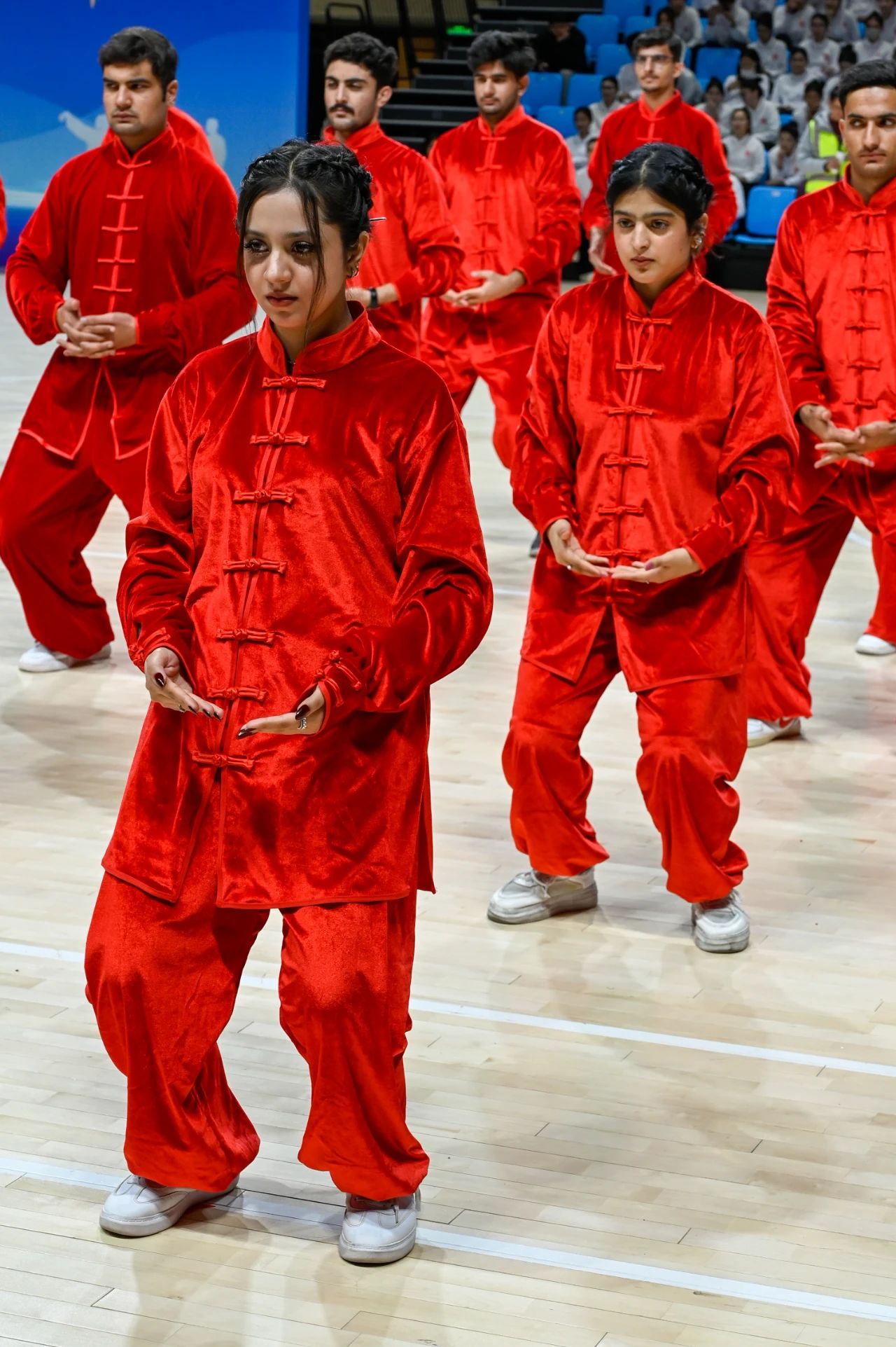 比赛中,各学院参赛队伍身着统一的运动服饰,精神饱满,动作规范。他们跟随音乐的节奏,缓缓起势,每一个动作都流畅有力。从“双手托天理三焦”到“背后七颠百病消”,时而双臂开弓,时而攒拳怒目,一招一式如行云流水,张弛有度、刚柔相济,生动诠释了健身气功·八段锦“动静相兼、柔筋健骨、形与神合、气蕴其中”的健身特点和浓厚的中医养生文化特色。同学们不仅展现了八段锦的独特魅力,而且表现出了良好的身体素质和积极向上的精神风貌。