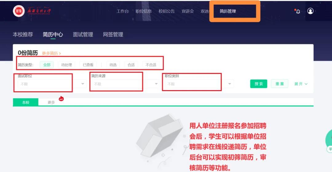 5.特别提示:此次校园双选会,用人单位登录学校智慧就业平台,点击“简历管理”在线上也可以同步接收Beat365毕业生简历。