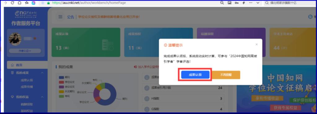 登录“作者服务平台”(au.cnki.net)进行成果认领,这一步骤至关重要,将直接影响到作者的学术成果能否被正确计算,进而影响是否能够荣登中国知网高被引学者名单。
