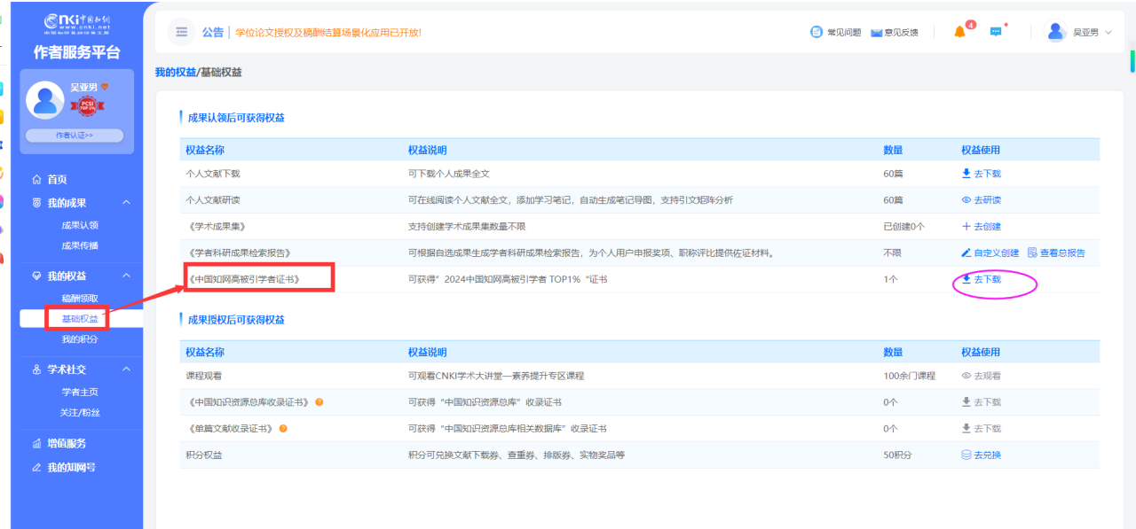 作者一旦成功认领本人成果,系统将启动实时计算机制。当作者学术影响力达到榜单入选标准时,作者服务平台将提示领取“2024中国知网高被引学者”电子证书,实现一键下载。还可通过作者服务平台左侧导航栏【我的权益】-【基础权益】下载该证书。