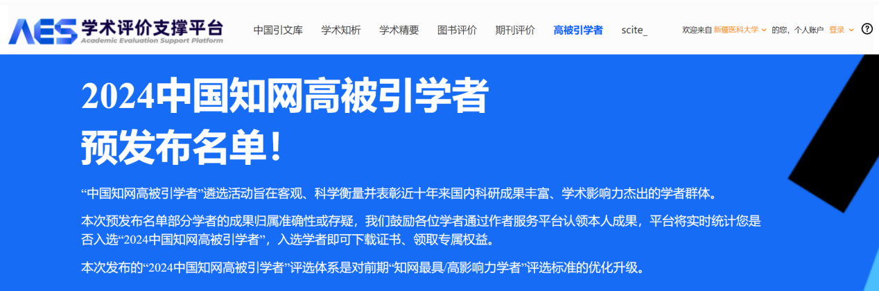 本次预发布名单的作者机构、学科等信息是基于中国知网总库数据自动计算得出的,需要作者本人登陆网址认领成果,详见下方2024中国知网高被引学者”认证、成果认领办法。