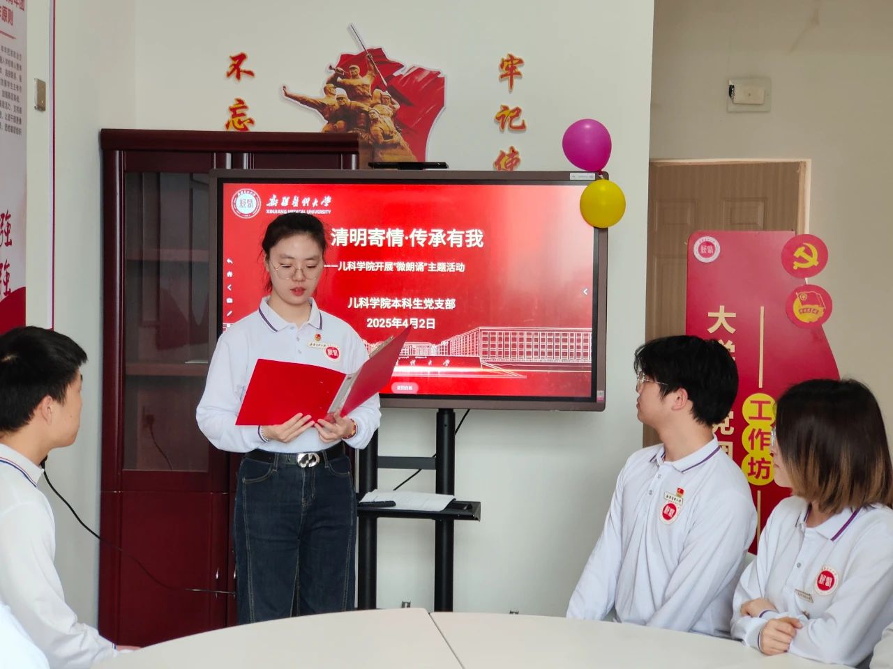 儿科学院在“一站式”社区“大学生党团建设工作坊”中组织开展“清明寄情·传承有我”暨“微朗诵”主题活动。新医学子饱含深情,用真挚的情感讲述革命烈士对理想信念的坚守与亲人的牵挂,表达对革命先烈的崇高敬意,厚植爱国主义情怀。