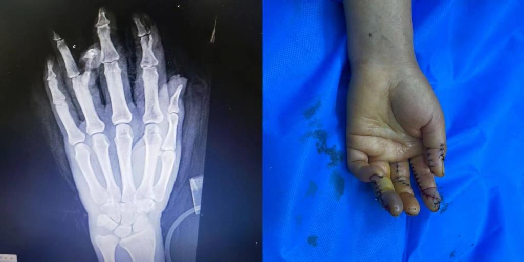 术后患者损伤严重的手恢复了基本形态,手指末梢血液循环逐步恢复。目前患者的情况基本平稳,在医院等待进一步观察和恢复。