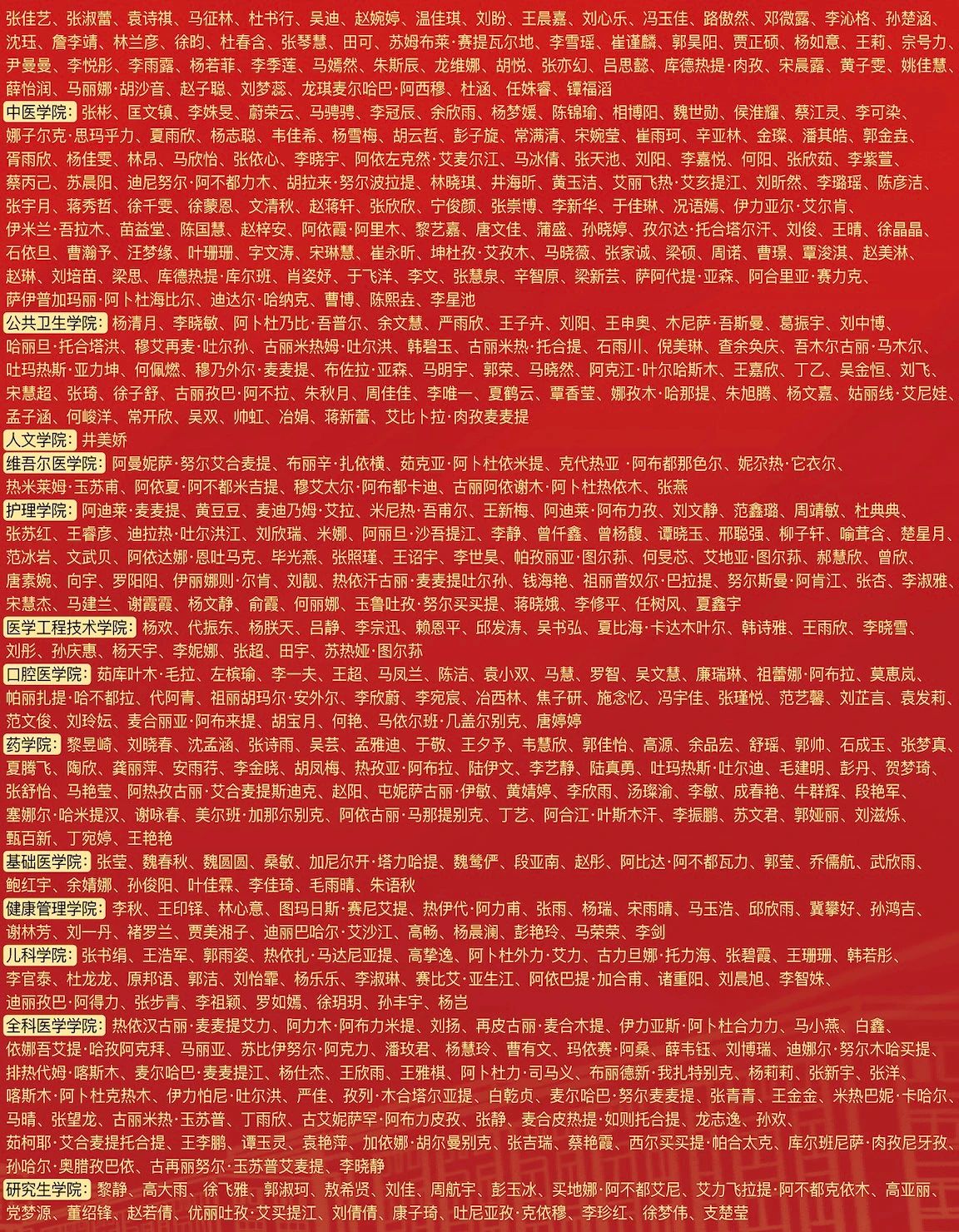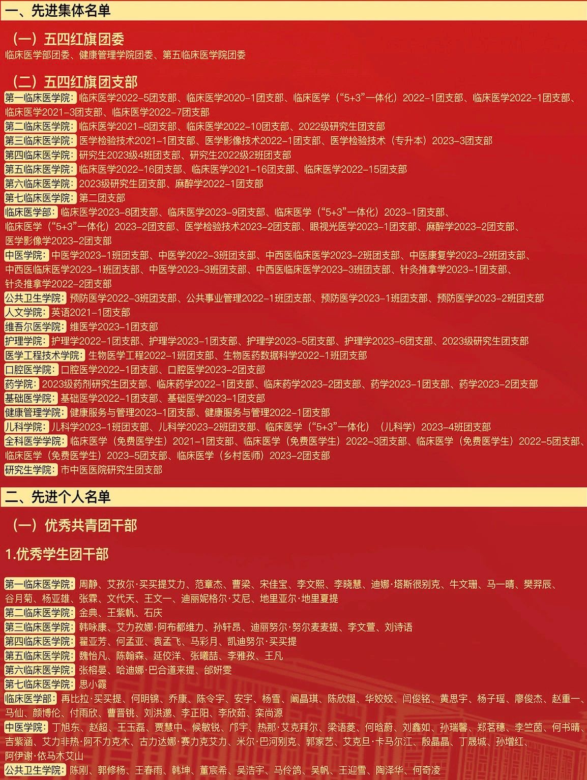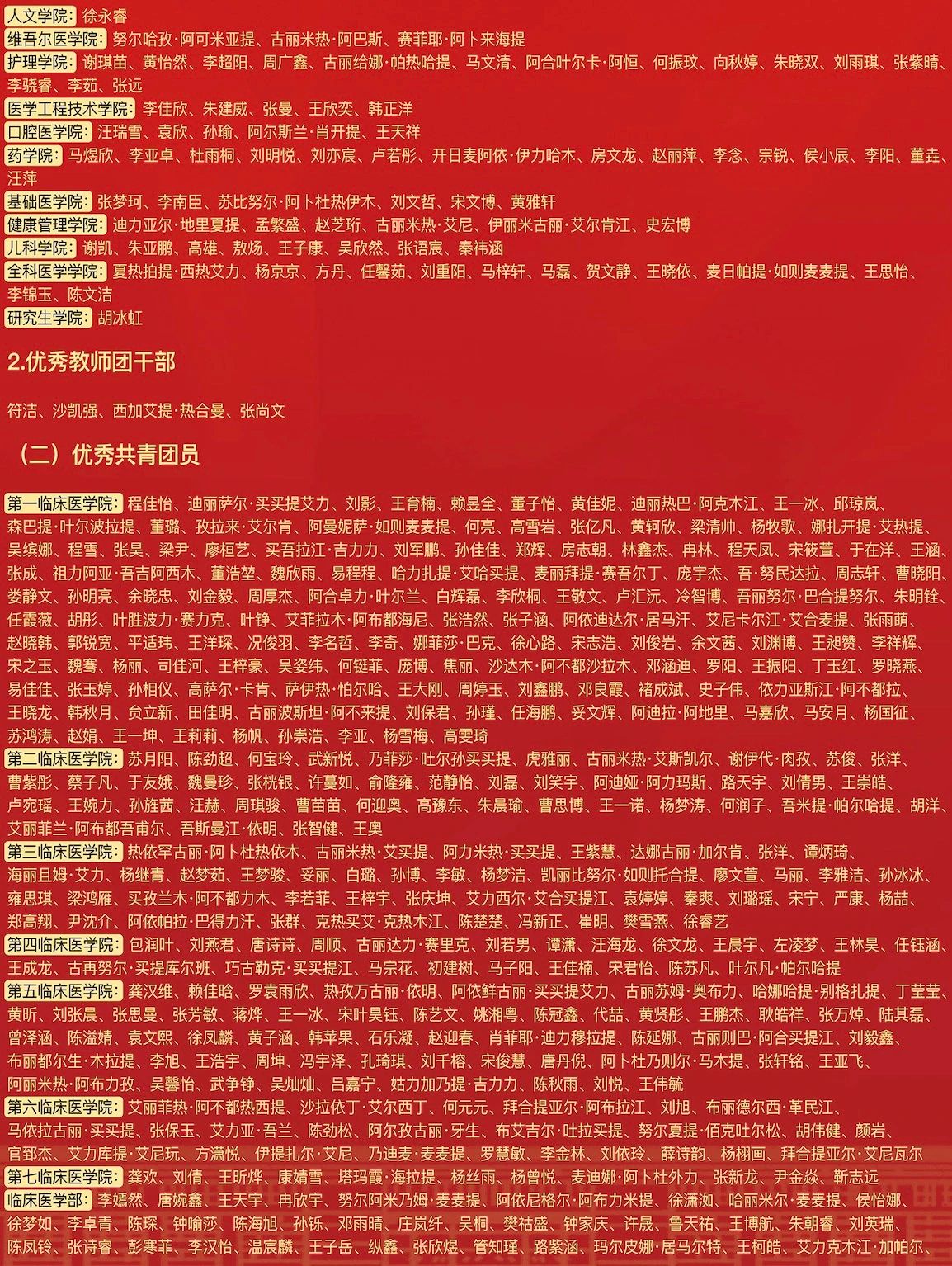会议宣读了《关于表彰2024年度共青团先进集体和先进个人的决定》,授予临床医学部团委等3个团组织“五四红旗团委”称号;授予临床医学2022-5班团支部等70个团支部“五四红旗团支部”称号;授予周静等181人“优秀共青团干部”称号;授予迪丽萨尔·买买提艾力等920人“优秀共青团员”称号。