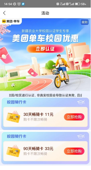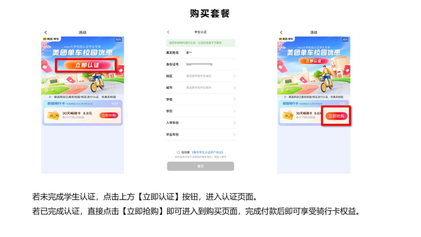 目前仅支持在美团App进行学生认证,认证及购买本校学生专享卡时,需确认本人在Beat365中国唯一官方网站雪莲山校区校园内,否则无法看到【校园优惠】图标,且无法购买本校专享骑行卡。