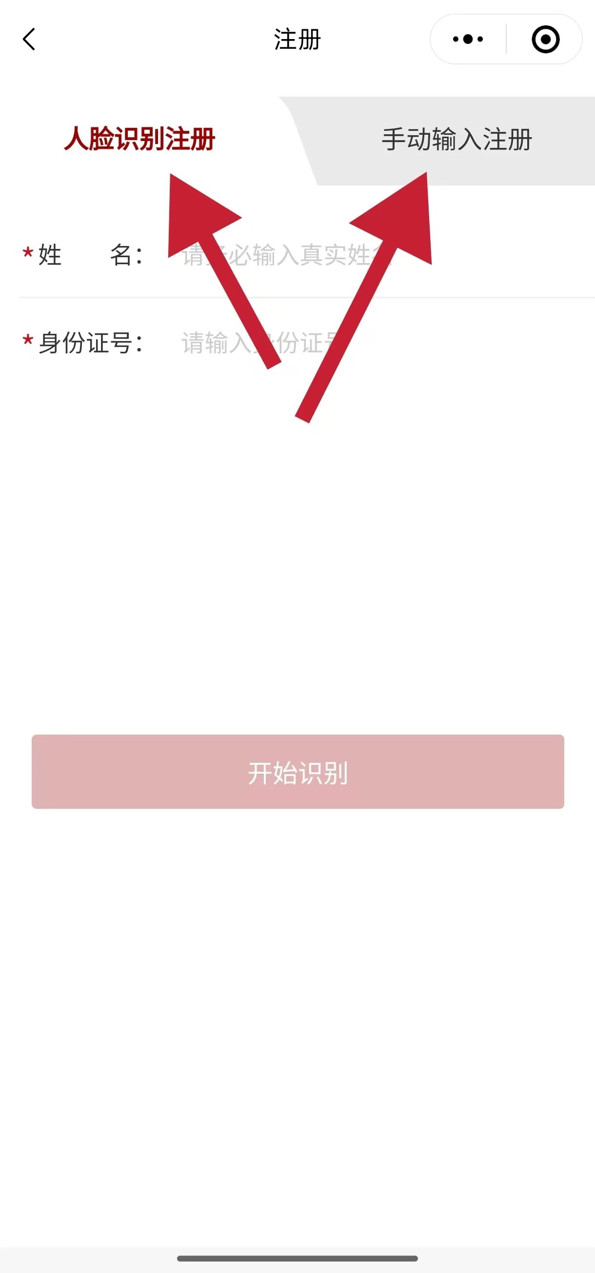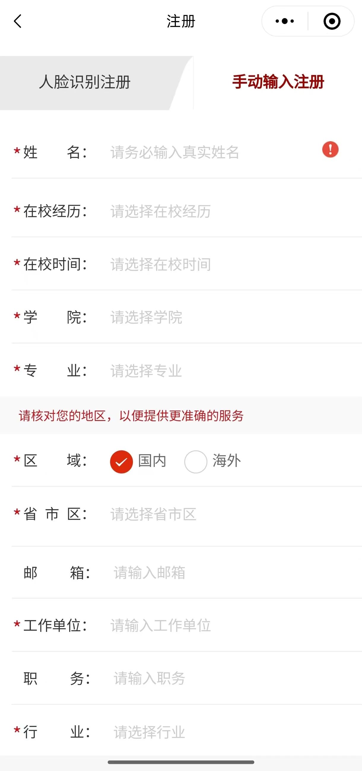 2.您可以选择【人脸识别】和【手动输入】两种方式进行注册(您所有信息都将被严格保密),并填写好下图中的信息点击提交,※号为必填。为提高大家注册自动通过率,可优先选择人脸识别方式注册。