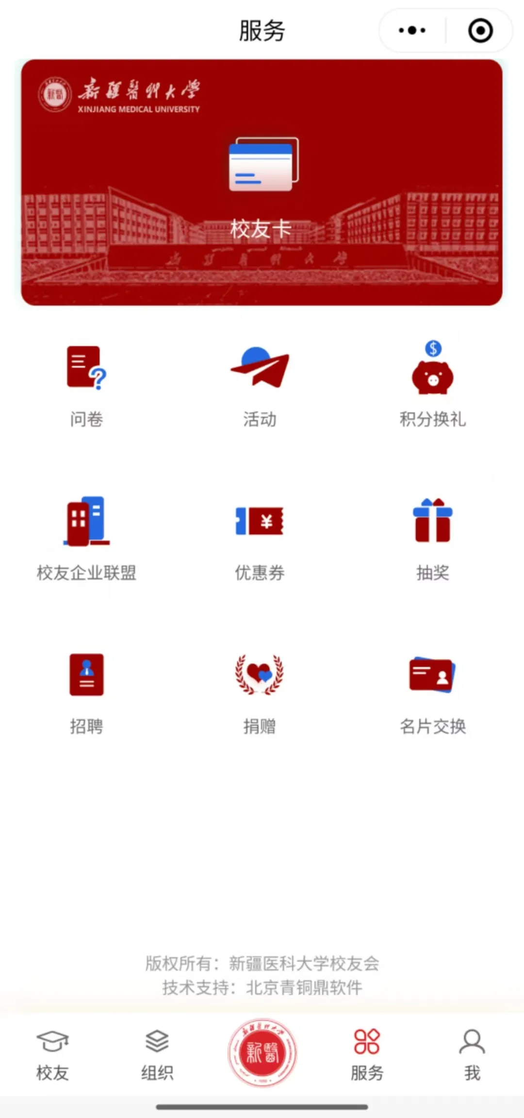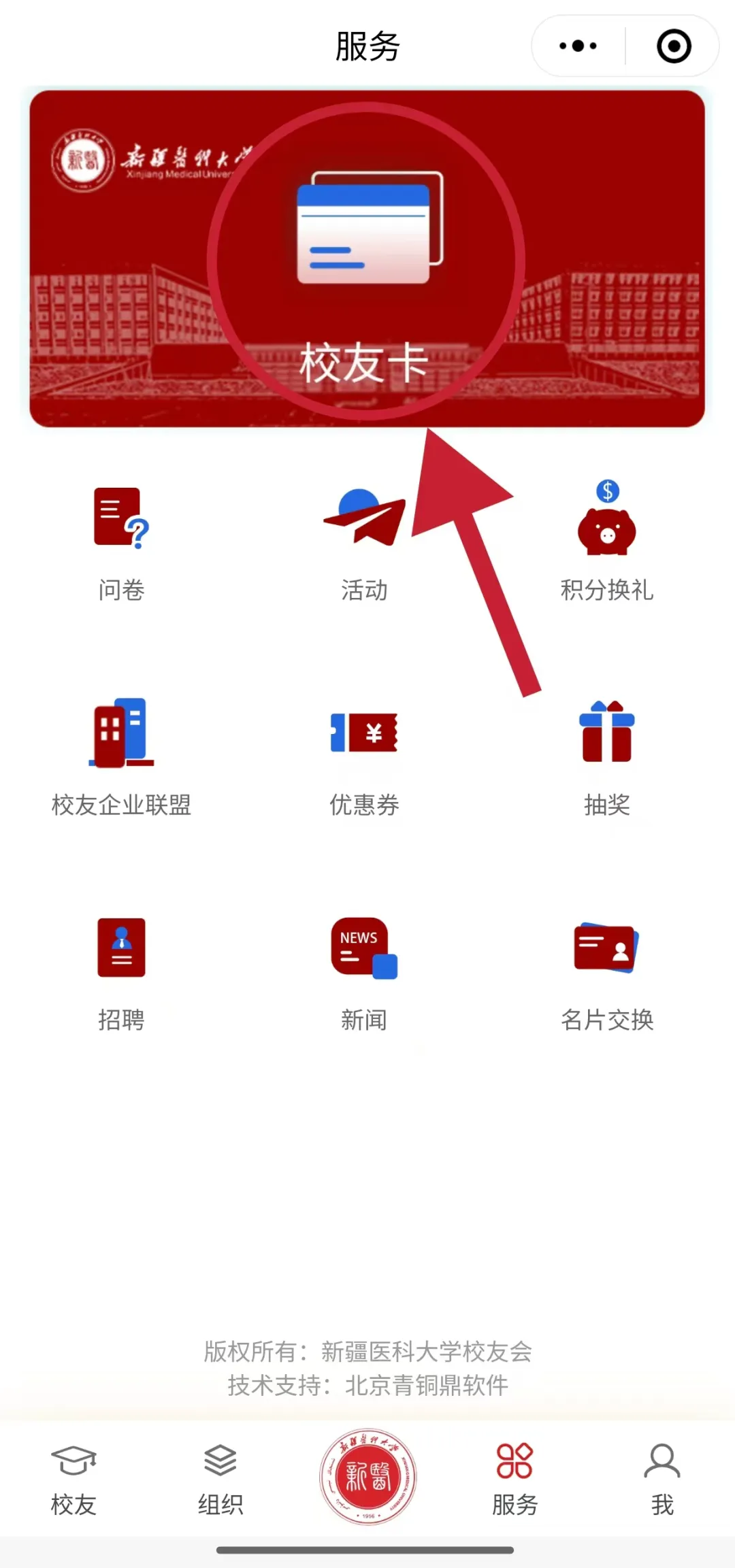 注册成功后,点击【服务】—【校友卡】,填写信息。