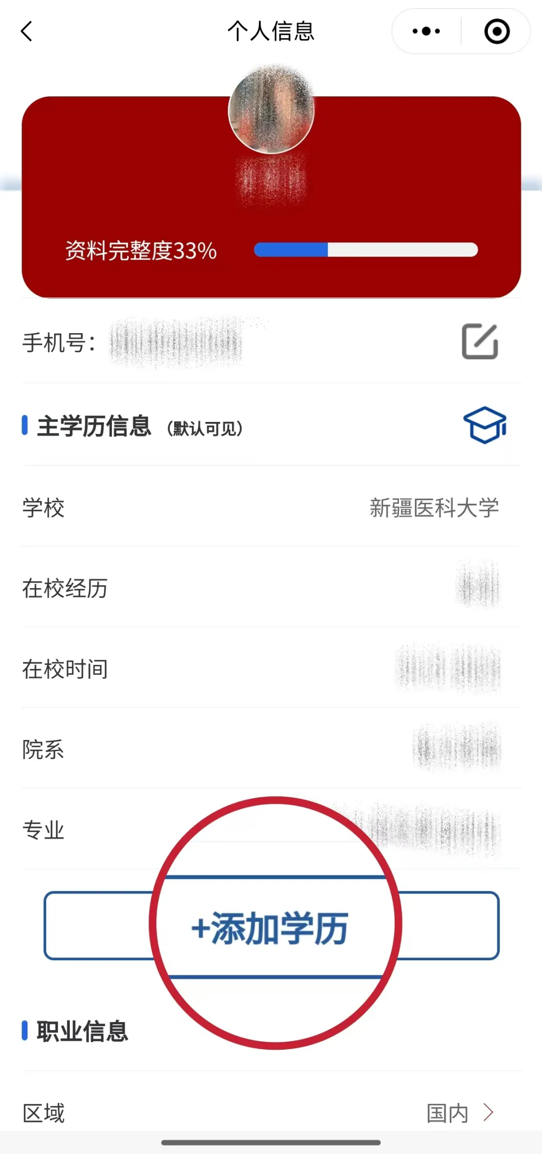 若您有多段在校经历,可点击右上角的【修改学籍】,选择您想在校友卡中展现的学历信息;若修改学籍中所展示的学历信息不全,可前往【我的】—【个人信息】—【添加学历】进行补充。