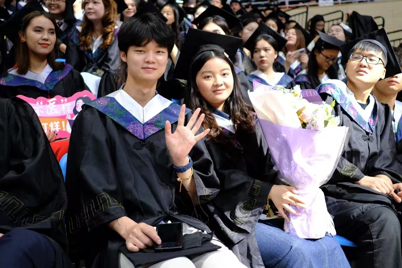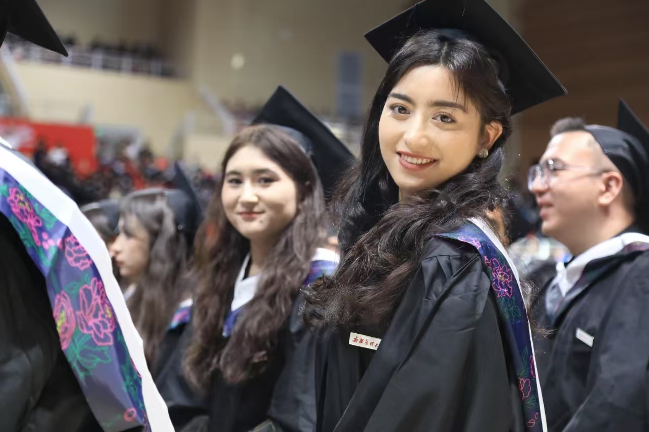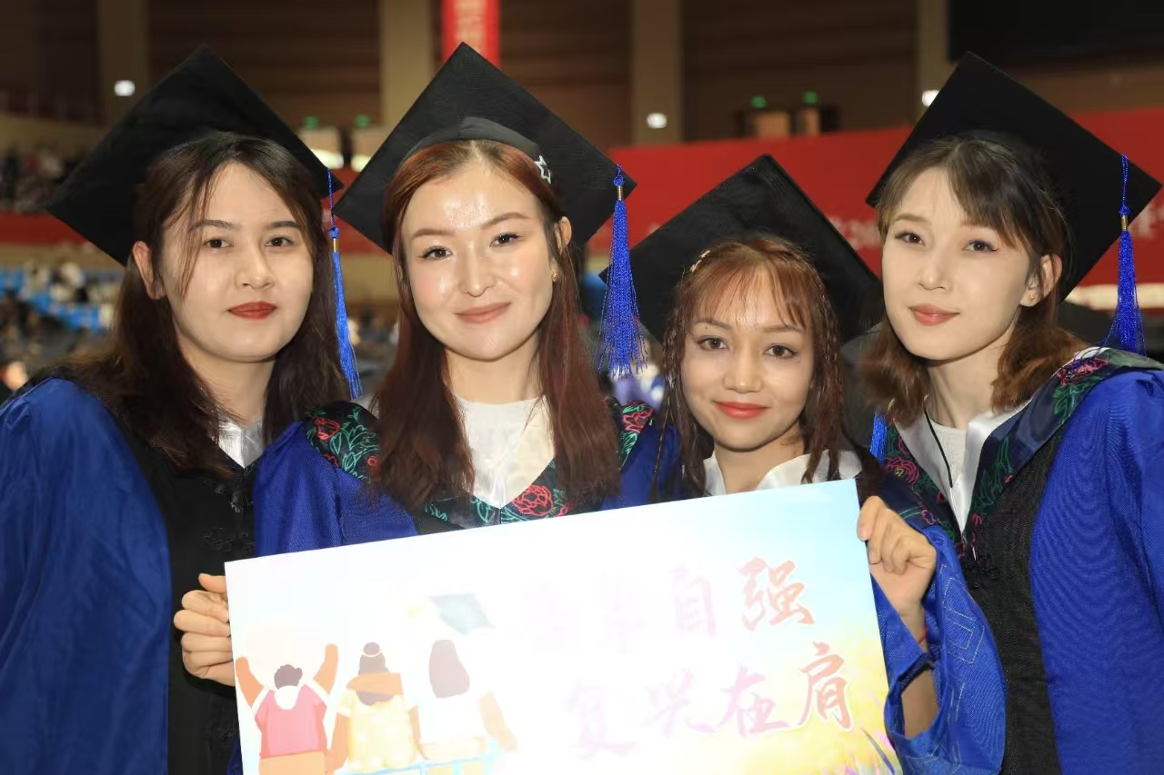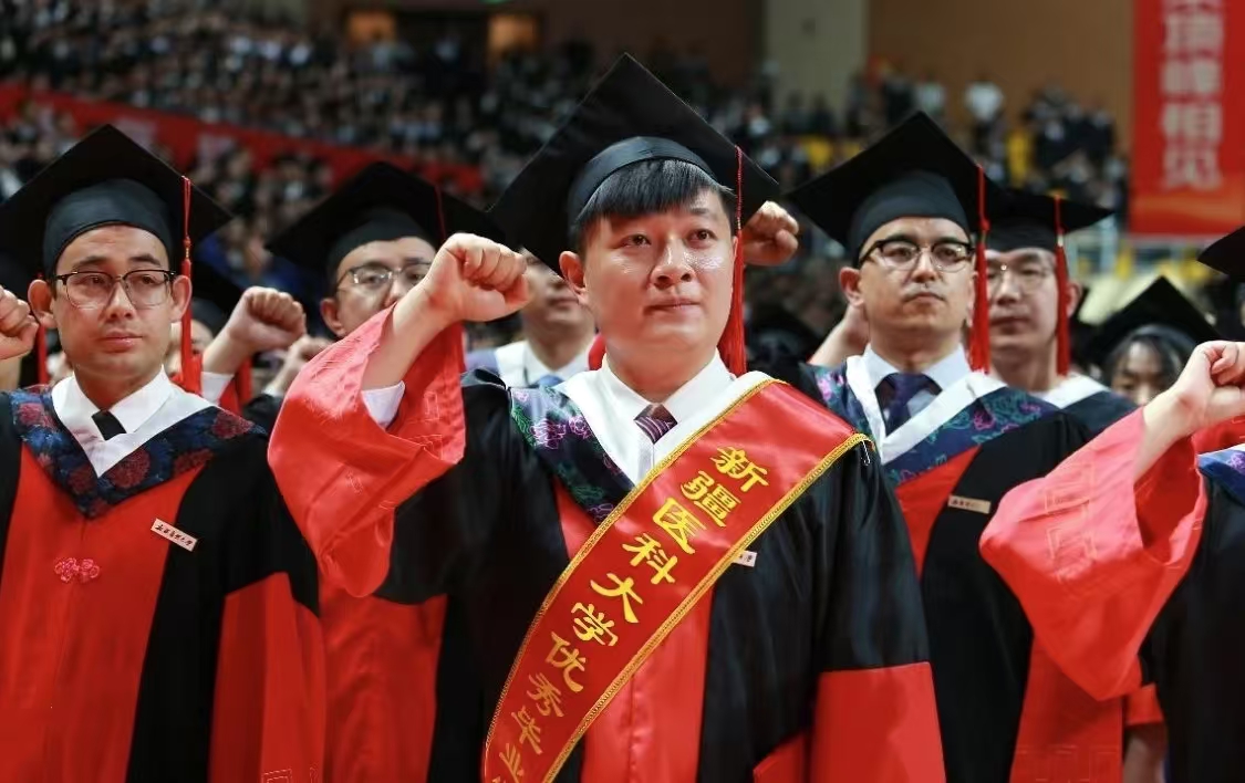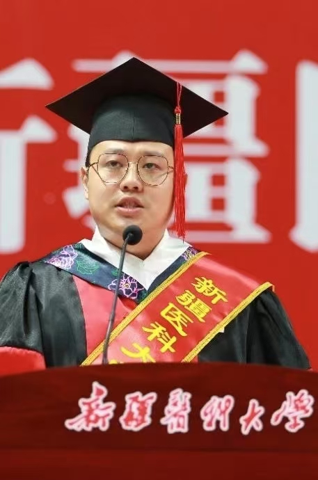 新医教学名师,中医学院教师、博士生导师徐海燕向毕业生们殷切寄语,希望新医学子以新医人扎根边疆的赤子情怀,将医者仁心熔铸于“服务人民、奉献社会”的初心使命,凭精湛医术回应人民期盼,在辽阔疆域筑起生命健康的牢固防线。本科生代表、公共卫生学院预防医学专业2020-2班学生哈丽米然·吐尔逊买买提,研究生代表、第一临床医学院骨科学专业2022级博士班学生贾麒钰和留学生代表、国际教育学院学生瓦吉德·乌拉在发言中,深情回忆了在新医难忘的求学时光,回顾了在青春赛道上奋力奔跑,担当责任和光荣使命的成长历程,表达了对倾注心血、培育学子成长的母校和老师的敬意与感谢。毕业生们表示,要永远铭记医学生誓言,用所学知识守护人民健康,以专业技能助力“健康中国”蓬勃发展,到祖国和人民最需要的地方发光发热,为中国式现代化建设贡献青春力量。