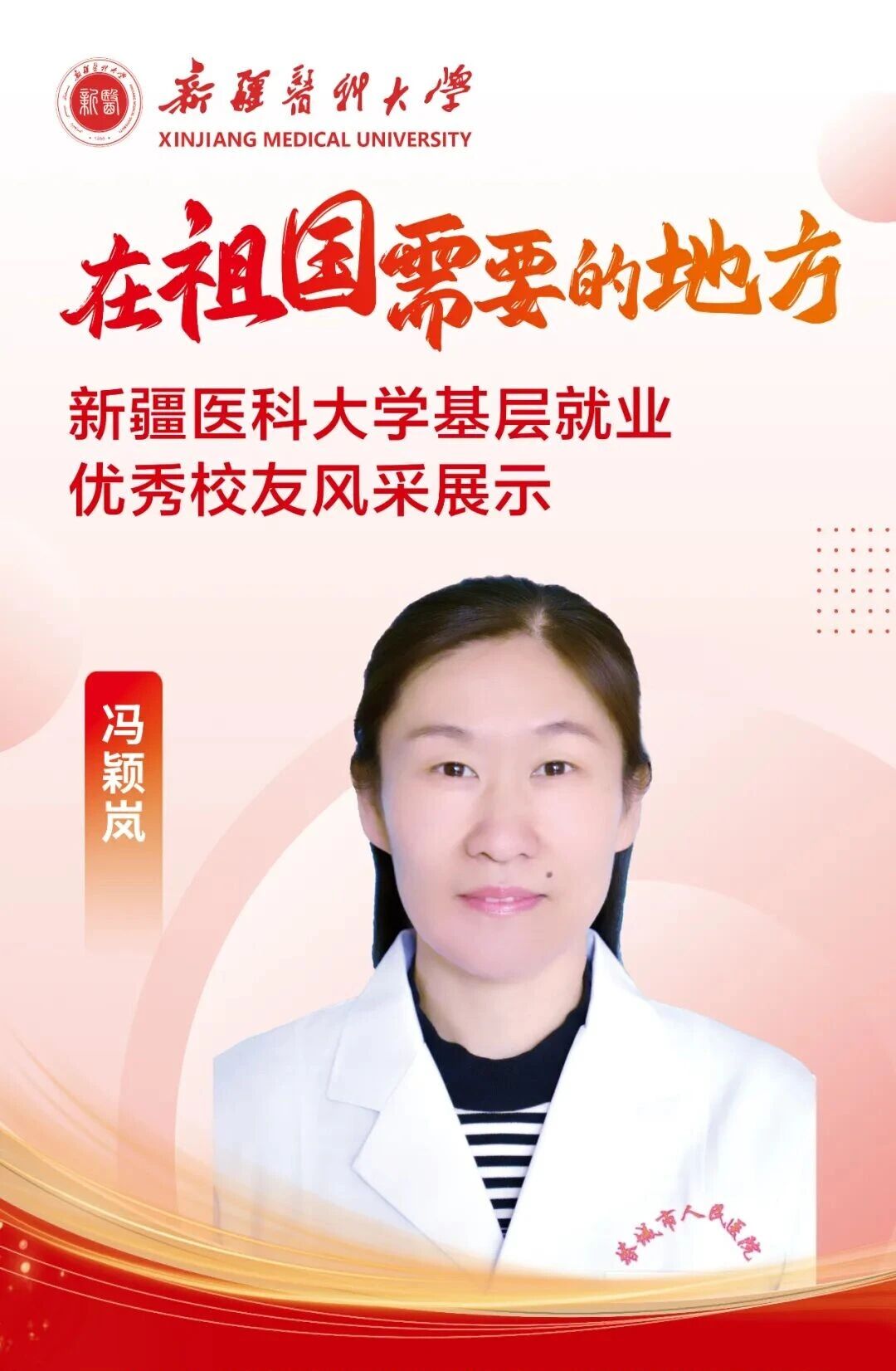 冯颖岚,1996毕业于临床医学院临床医学专业,现任塔城市人民医院内分泌老年病科主任。毕业后她放弃前往大城市发展的机会,在塔城市人民医院坚守29年,成为患者眼中的“最美医生”。她秉持“医病医身医心”的理念,始终把病人放在第一位。曾不顾恶臭与蛆虫,全力抢救孤寡老人;大年三十放下碗筷,赶赴医院救治危重患者。她不仅医术精湛,更用笑容和关怀温暖患者,收获了患者和家属满满的信任与感谢的锦旗。她精通哈萨克语,主动结对帮扶各族群众,用医术和真诚促进民族团结。她说:“病治好了,感情就拉近了。”她也是一名军嫂,默默支持丈夫守边,还主动帮助官兵家属就医,被战士们亲切地称为“军妈妈”。29年来,冯颖岚把青春献给了基层,在平凡岗位上书写着不凡。她让我们看到,基层不仅是施展才华的舞台,更是传递温暖、实现价值的沃土。在这里,每一份坚守都会被铭记,每一次付出都意义非凡。