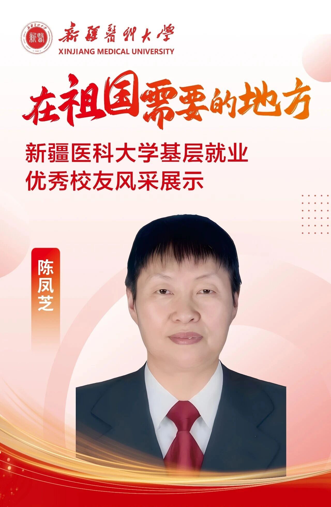 陈凤芝,中共党员,1990年毕业于公共卫生学院预防医学专业,温宿县疾病预防控制中心原二级主任科员。毕业后,她毅然返回家乡阿克苏地区温宿县,从妇幼保健站起步,先后在红十字会、卫生监督执法局等多个岗位工作,32年如一日扎根基层卫生战线。在妇幼保健站的13年里,她身兼医生、档案员、B超师等多项工作任务,建立三级疾病预防档案体系,有效降低了孕产妇和婴幼儿的死亡率。调任当地红十字会后,她带领3个人的团队完成了10万人的急救技能培训,大幅提升群众的急救知识知晓率。在卫生监督执法局工作时,她严格执法、创新普法,被誉为医疗市场的守卫者。32年来,陈凤芝始终践行"预防医学的价值在于扎根基层、防患于未然"的理念,将专业知识和青春热血奉献给了边疆医疗卫生事业。她曾6次无偿献血,多次荣获自治区级表彰。这位基层卫生战线的"老兵"用半生坚守证明:真正的成长在于扎根,真正的价值在于奉献。她的故事将激励新一代医学生走向基层,在祖国最需要的地方绽放青春光芒。