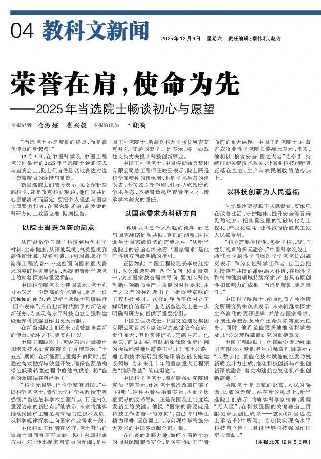 新当选院士们纷纷表示,无论深耕基础科学,还是攻克科研难题,他们的共同心愿都清晰而坚定:要把个人理想与国家大局紧密相连,在国家最紧迫、最关键的科研方向上攻坚克难、挺膺担当。