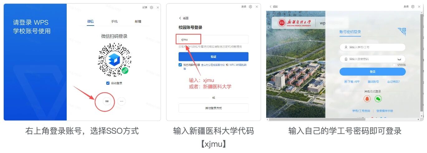 打开WPS365教育版或WPS协作教育版登录,点击右上角登录,选择SSO方式,输入学校名称或者代码【xjmu】,使用学工号和密码登录即可。